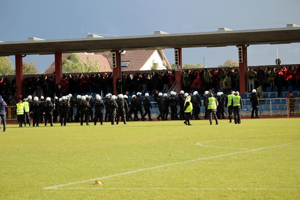 - 03.10.2018, Sandomierz: Podczas meczu Pucharu Polski w Sandomierzu w którym trzecioligowa Wisła zmierzyła się z ekstraklasową Koroną Kielce doszło do zamieszek. Kibice Wisły Sandomierz wybiegli na boisko, a mecz został przerwany na blisko 30 minut. Interweniować musiała policja (fot. Karol Twardowski)