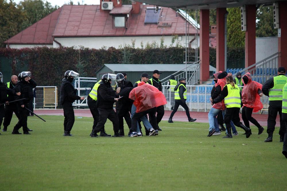 - 03.10.2018, Sandomierz: Podczas meczu Pucharu Polski w Sandomierzu w którym trzecioligowa Wisła zmierzyła się z ekstraklasową Koroną Kielce doszło do zamieszek. Kibice Wisły Sandomierz wybiegli na boisko, a mecz został przerwany na blisko 30 minut. Interweniować musiała policja (fot. Karol Twardowski)