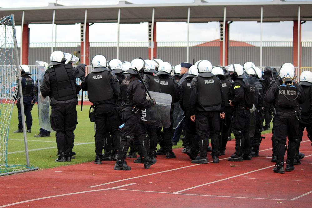 - 03.10.2018, Sandomierz: Podczas meczu Pucharu Polski w Sandomierzu w którym trzecioligowa Wisła zmierzyła się z ekstraklasową Koroną Kielce doszło do zamieszek. Kibice Wisły Sandomierz wybiegli na boisko, a mecz został przerwany na blisko 30 minut. Interweniować musiała policja (fot. Karol Twardowski)