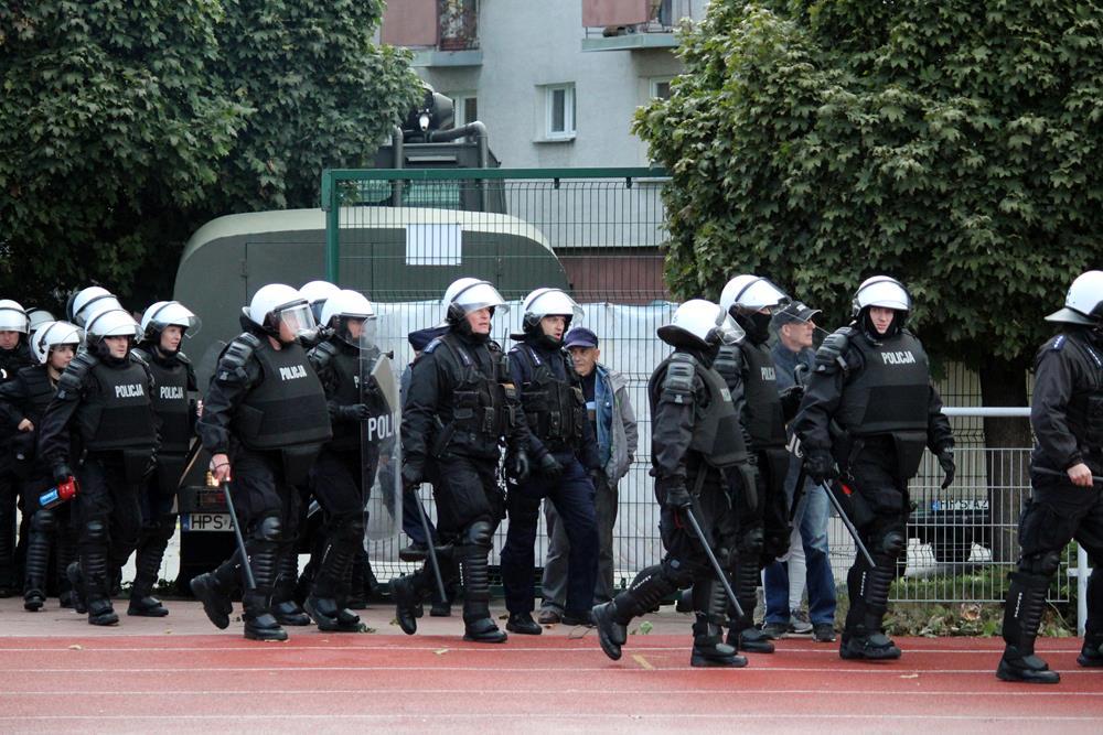 - 03.10.2018, Sandomierz: Podczas meczu Pucharu Polski w Sandomierzu w którym trzecioligowa Wisła zmierzyła się z ekstraklasową Koroną Kielce doszło do zamieszek. Kibice Wisły Sandomierz wybiegli na boisko, a mecz został przerwany na blisko 30 minut. Interweniować musiała policja (fot. Karol Twardowski)