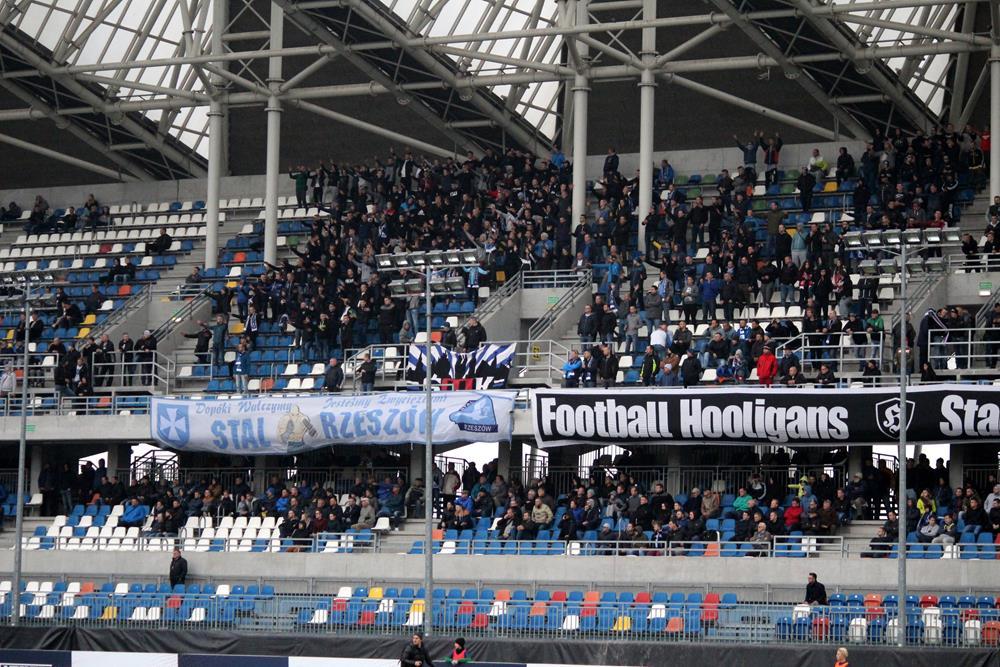 Zdjęcia z trybun podczas meczu 3 ligi grupy IV pomiędzy Stalą Rzeszów a Motorem Lublin (kibice, oprawa).