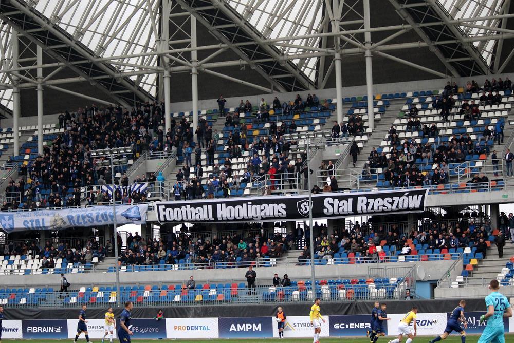 Zdjęcia z trybun podczas meczu 3 ligi grupy IV pomiędzy Stalą Rzeszów a Motorem Lublin (kibice, oprawa).