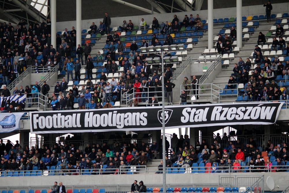 Zdjęcia z trybun podczas meczu 3 ligi grupy IV pomiędzy Stalą Rzeszów a Motorem Lublin (kibice, oprawa).
