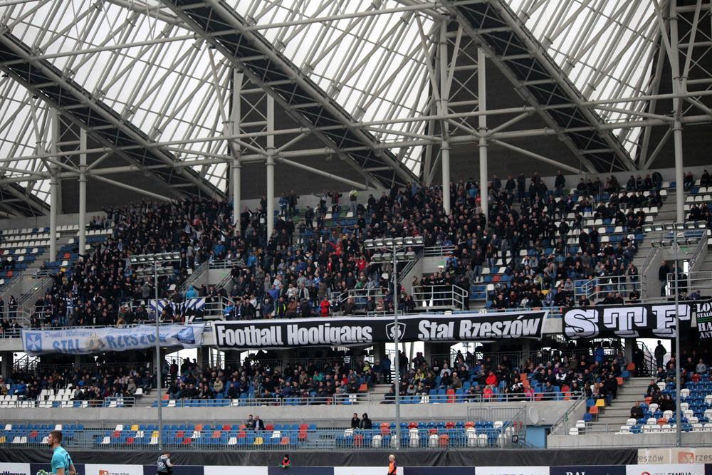 Zdjęcia z trybun podczas meczu 3 ligi grupy IV pomiędzy Stalą Rzeszów a Motorem Lublin (kibice, oprawa).