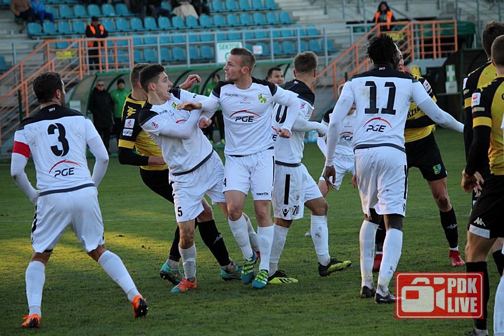 - 17.11.2018, Stadion Miejski w Tarnobrzegu. Piłkarze Siarki Tarnobrzeg (żółto-czarne stroje) ulegli 0-1 drużynie PGE GKS-u Bełchatów w meczu 17. kolejki 2 ligi (fot. Radosław Kuśmierz)