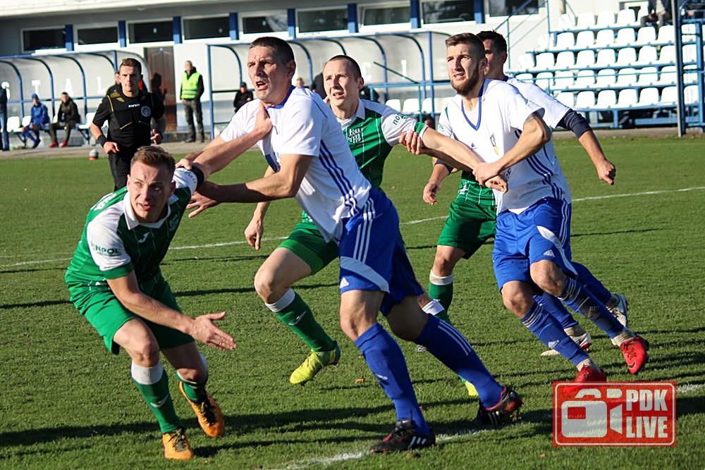 - 17.11.2018, Gorzyce. Piłkarze Wisłoki Dębica (biało-zielone stroje) pokonali Stali Gorzyce 2-1 w wyjazdowym spotkaniu 4 ligi podkarpackiej (fot. Radosław Kuśmierz)
