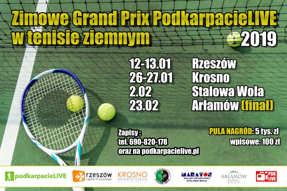 Trzy rundy eliminacyjne rozsiane po całym terenie województwa podkarpackiego: Rzeszów (korty ROSiR, 12-13.01), Krosno (korty MOSiR, 26-27.01) oraz Stalowa Wola (korty MKT, 02.02). Półfinalistów wymienionych rund czeka wielki finał na kortach Hotelu Arłamów**** (23 lutego). W cyklu Zimowe Grand Prix PodkarpacieLIVE może wziąć udział każdy. Na zwycięzcę czeka nagroda w wysokości 5 tysięcy złotych. Zapisy odbywają się za pośrednictwem portalu zrzutka.pl. Szczegółowych informacji udzielimy także pod numerami telefonów 690-820-178 oraz 724-531-425.