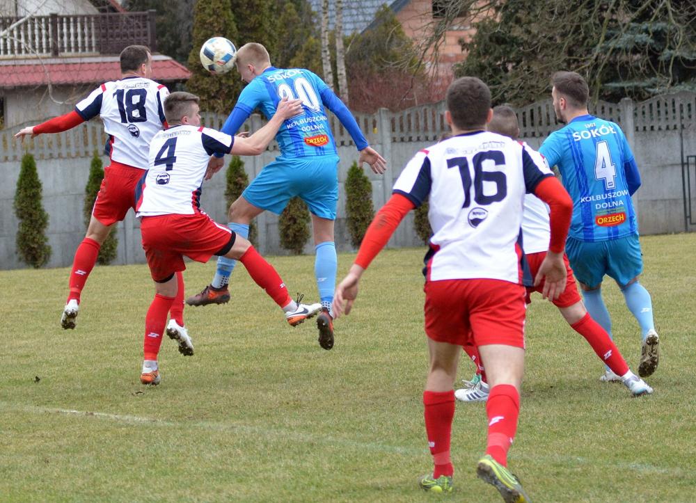 - 10.03.2019, 4 liga podkarpacka: Watkem Korona Rzeszów (białe koszulki) wygrała 2-1 w meczu 18. kolejki z Sokołem Kolbuszowa Dolna.