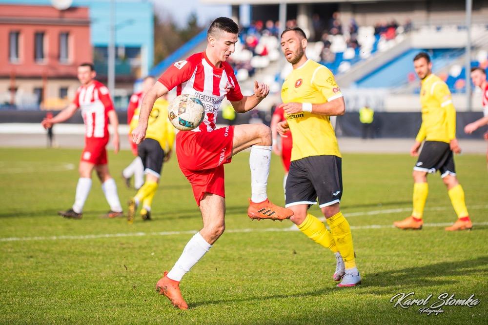 - 16 marca 2019, Stadion Miejski w Rzeszowie. Piłkarze Resovii (biało-czerwone koszulki) zremisowali 1-1 w meczu 2 ligi z faworyzowanym Widzewem Łódź. Gola dla "Pasiaków" jeszcze w pierwszej połowie strzelił Bartłomiej Makowski z rzutu karnego. Wyrównał po przerwie Rafał Wolsztyński (fot. Karol Słomka)