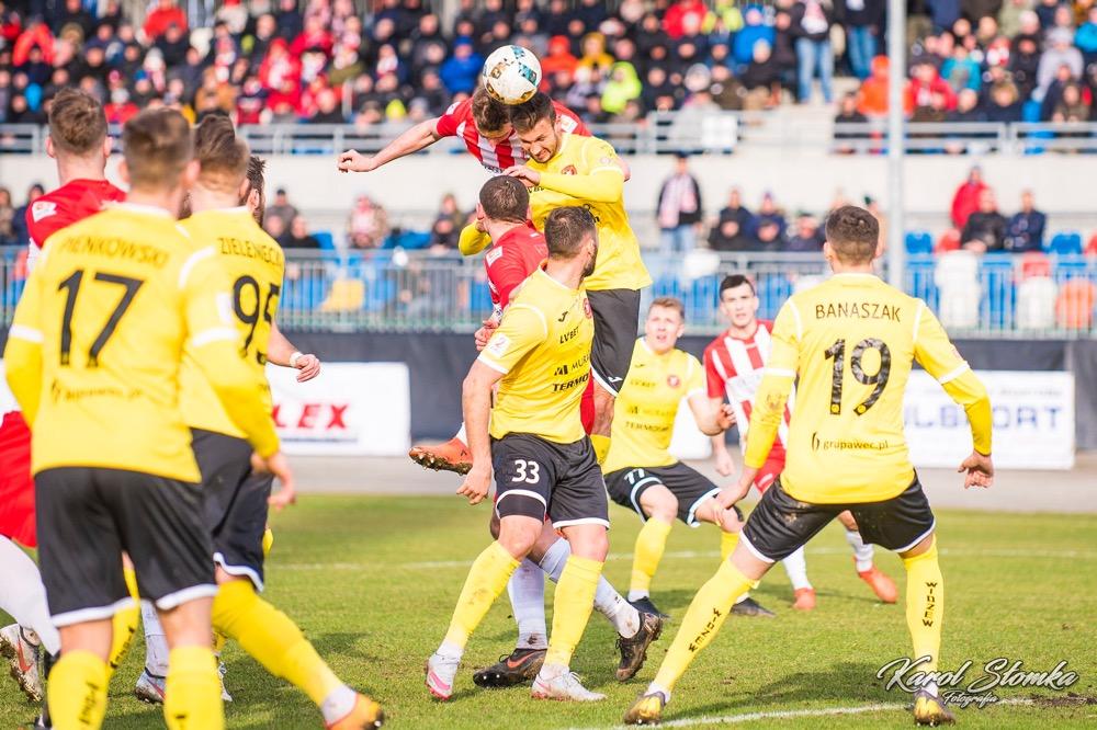 - 16 marca 2019, Stadion Miejski w Rzeszowie. Piłkarze Resovii (biało-czerwone koszulki) zremisowali 1-1 w meczu 2 ligi z faworyzowanym Widzewem Łódź. Gola dla "Pasiaków" jeszcze w pierwszej połowie strzelił Bartłomiej Makowski z rzutu karnego. Wyrównał po przerwie Rafał Wolsztyński (fot. Karol Słomka)