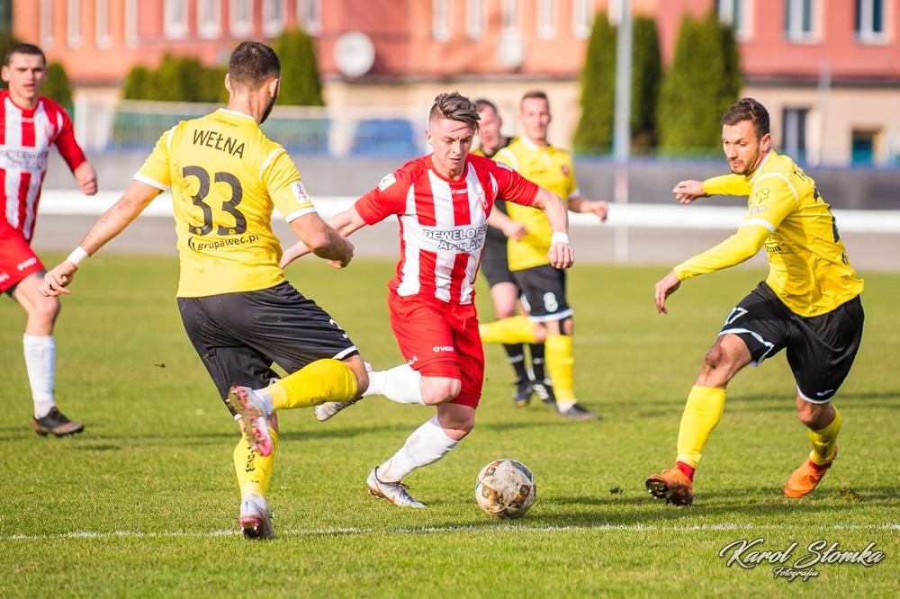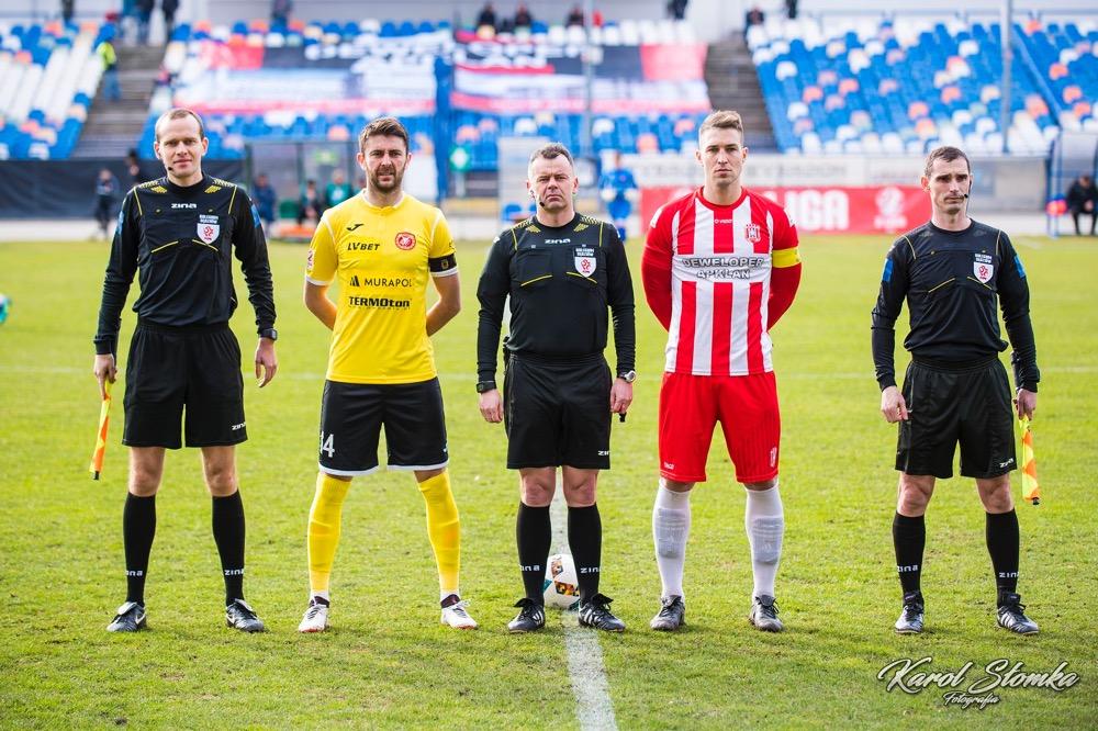 - 16 marca 2019, Stadion Miejski w Rzeszowie. Piłkarze Resovii (biało-czerwone koszulki) zremisowali 1-1 w meczu 2 ligi z faworyzowanym Widzewem Łódź. Gola dla "Pasiaków" jeszcze w pierwszej połowie strzelił Bartłomiej Makowski z rzutu karnego. Wyrównał po przerwie Rafał Wolsztyński (fot. Karol Słomka)