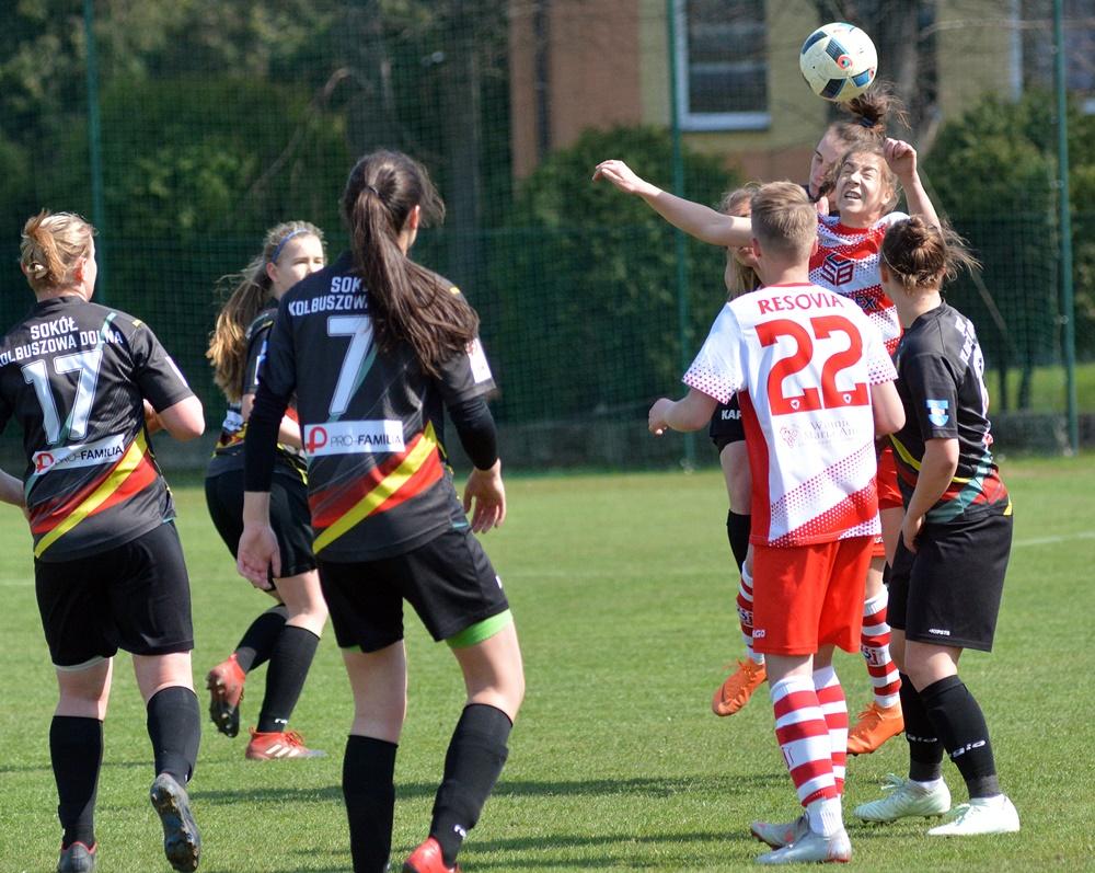 - 14.04.2019, Kolbuszowa Dolna. Zawodniczki Resovii (biało-czerwone stroje) wygrały w Derbach Podkarpacia z Sokołem Kolbuszowa Dolna 5-1 w meczu 1 ligi kobiet.