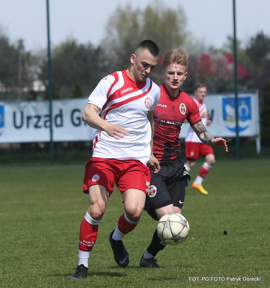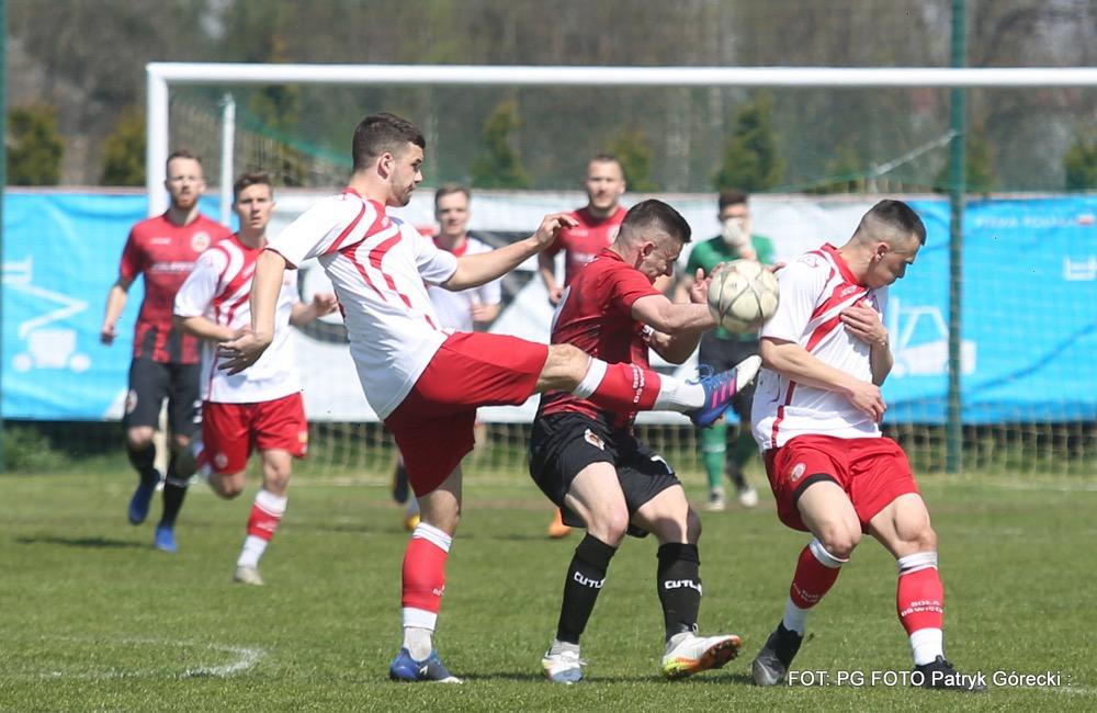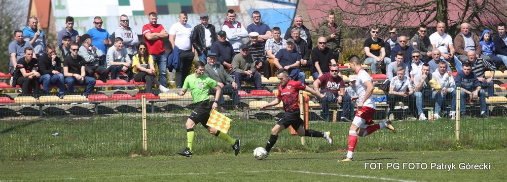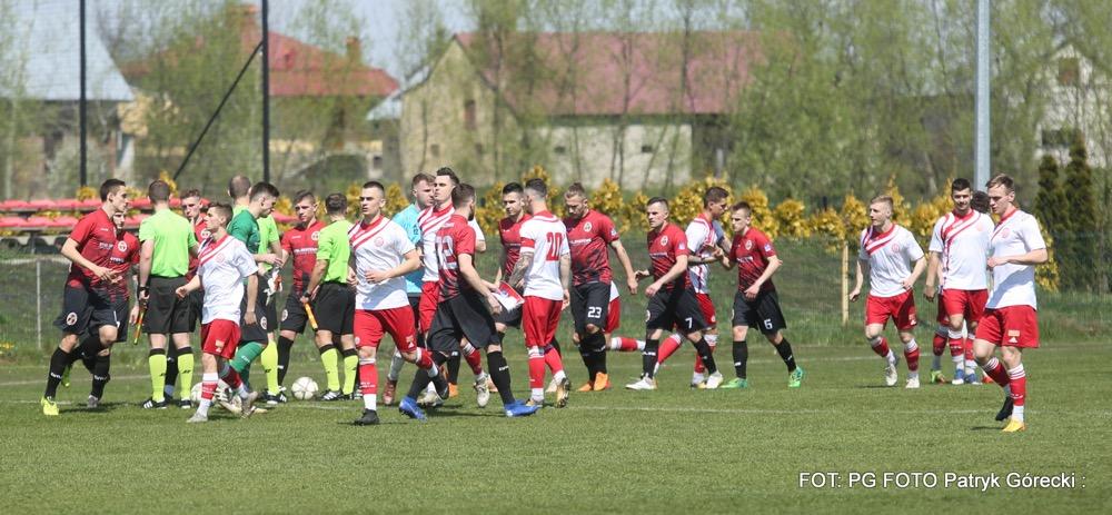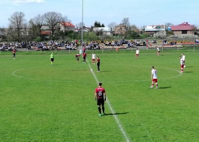 - 20.04.2019, Wielka Sobota. Gracze Wólczanki Wólka Pełkińska (czerwono-czarne stroje) przegrali 0-1 z Sołą Oświęcim w meczu 25. kolejki rozgrywek 3 ligi grupy IV (fot. Patryk Górecki)