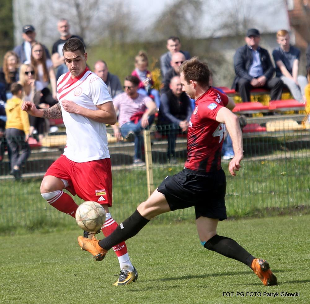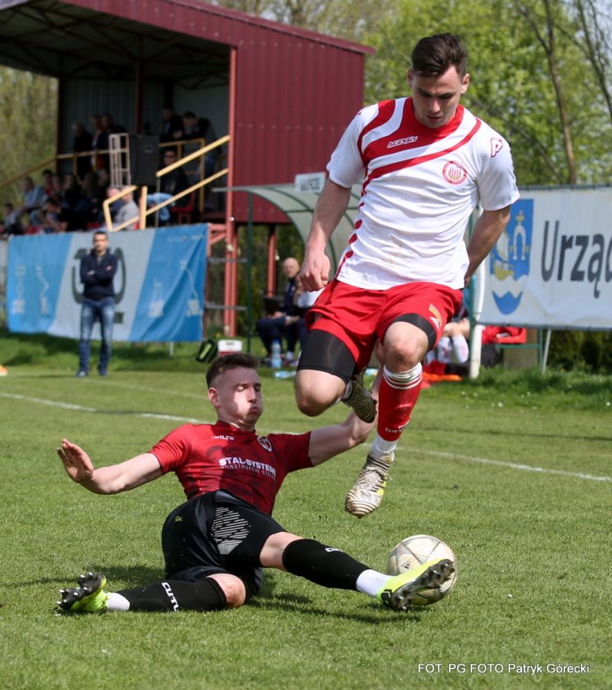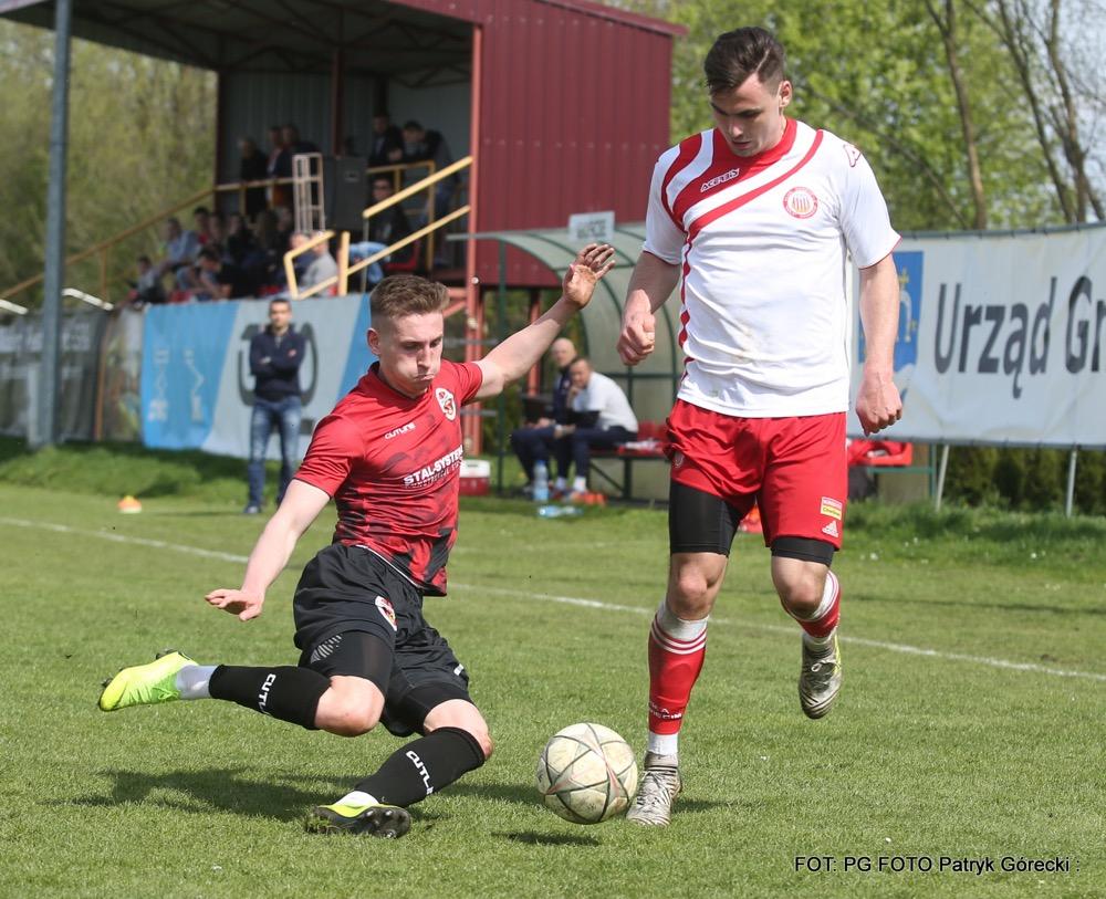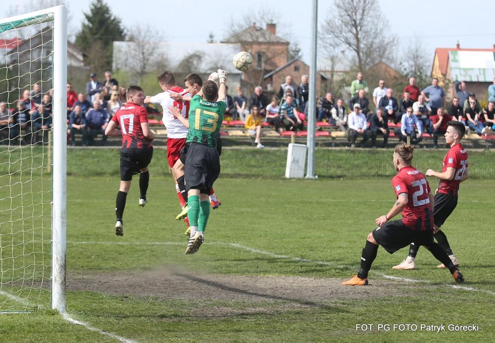 - 20.04.2019, Wielka Sobota. Gracze Wólczanki Wólka Pełkińska (czerwono-czarne stroje) przegrali 0-1 z Sołą Oświęcim w meczu 25. kolejki rozgrywek 3 ligi grupy IV (fot. Patryk Górecki)