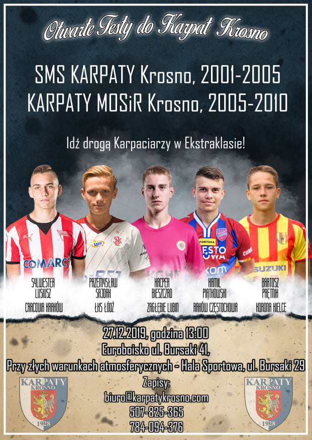 W dniu 27.12.2019 Karpaty Krosno przeprowadzą otwarte testy do SMS Karpaty Krosno, oraz Karpaty MOSiR Krosno.