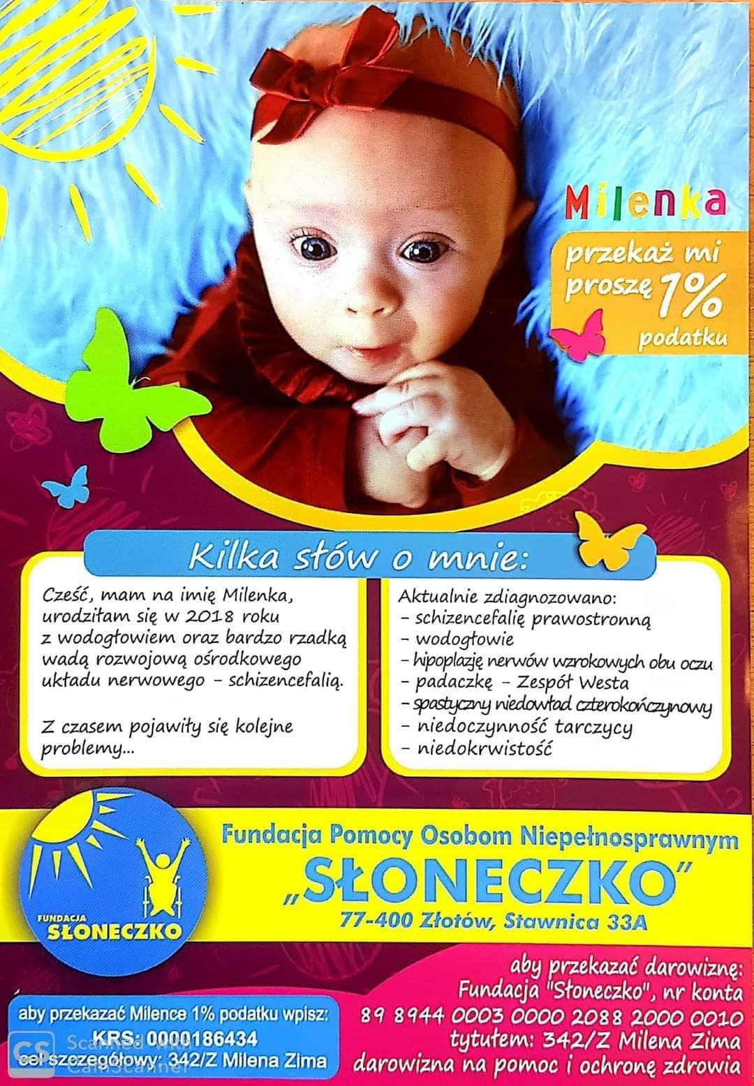 Całkowity dochód ze zbiórki przekazany zostanie na konto Fundacji Pomocy Osobom Niepełnosprawnym "Słoneczko, która wspiera leczenie Milenki.