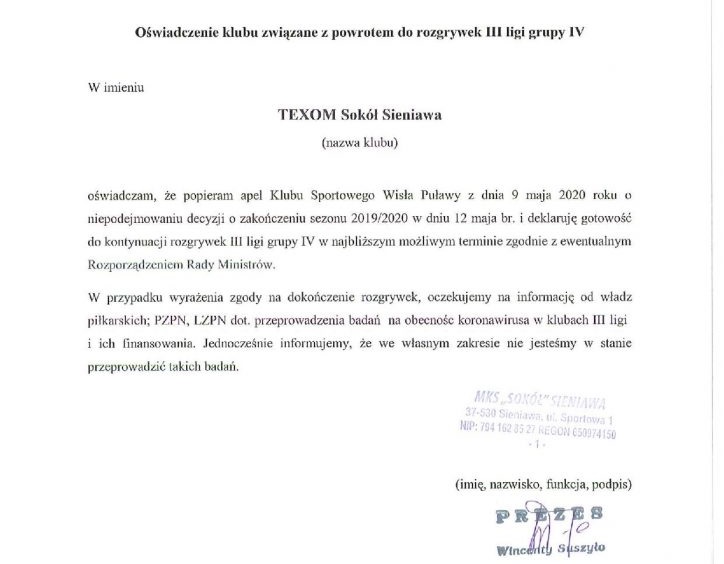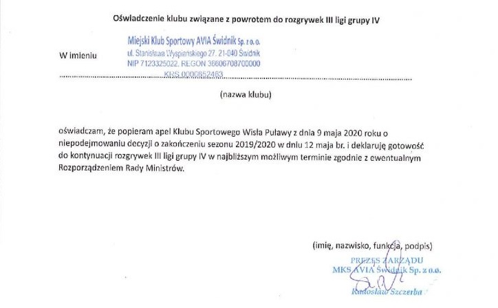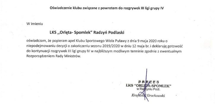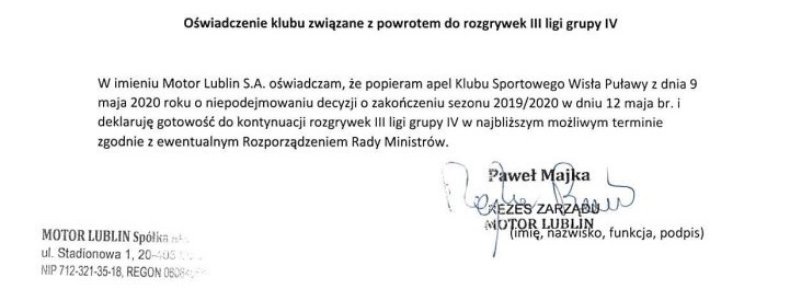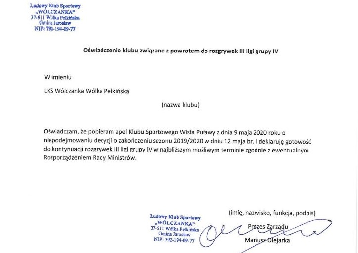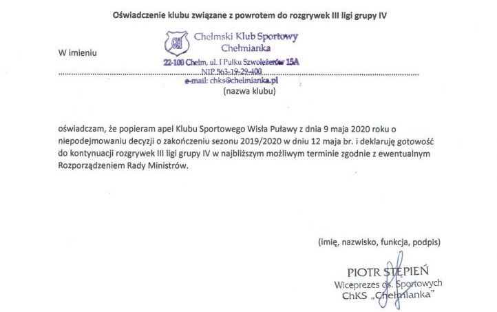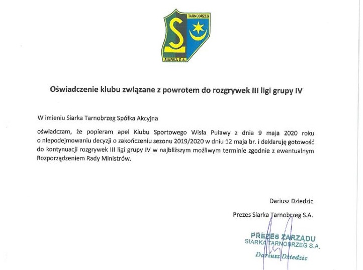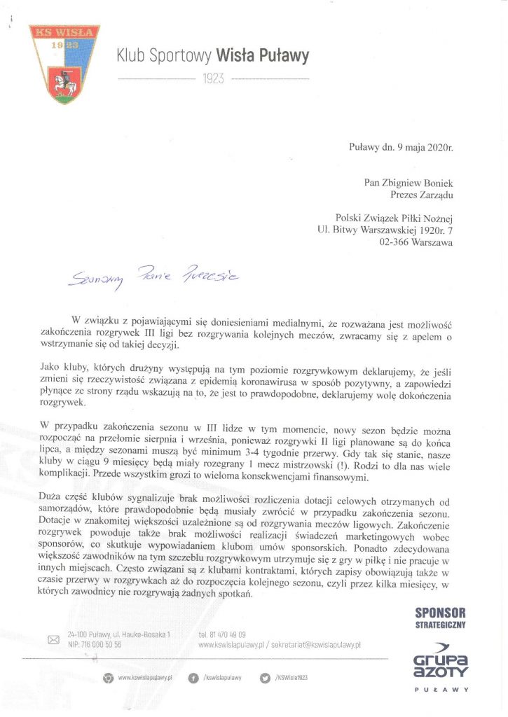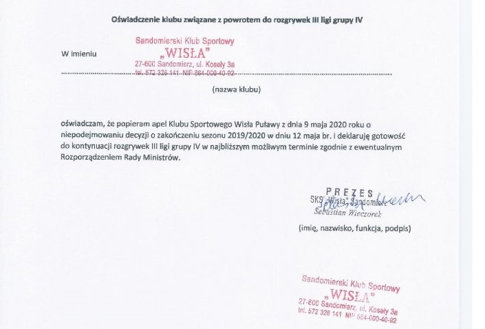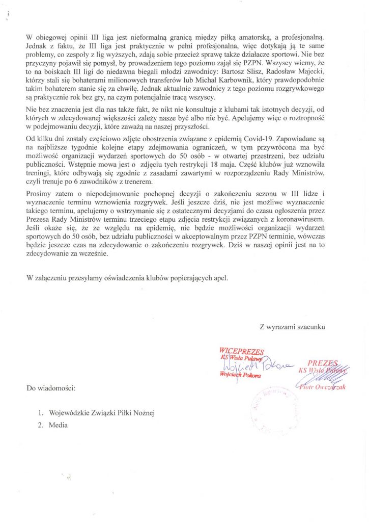 - W związku z doniesieniami medialnymi o możliwym zakończeniu sezonu w dniu 12 maja 2020 roku, Klub Sportowy Wisła Puławy zwraca się z apelem do Prezesa Polskiego Związku Piłki Nożnej o niepodejmowanie pochopnej decyzji, która skutkuje brakiem możliwości rozgrywania meczów ligowych aż do końca sierpnia br. Dodatkowo wyrażamy gotowość do wznowienia rozgrywek w najbliższym możliwym terminie, jeśli poprawi się sytuacja epidemiczna, zgodnie z ewentualnym Rozporządzeniem Rady Ministrów - czytamy na oficjalnej stronie Wisły Puławy.