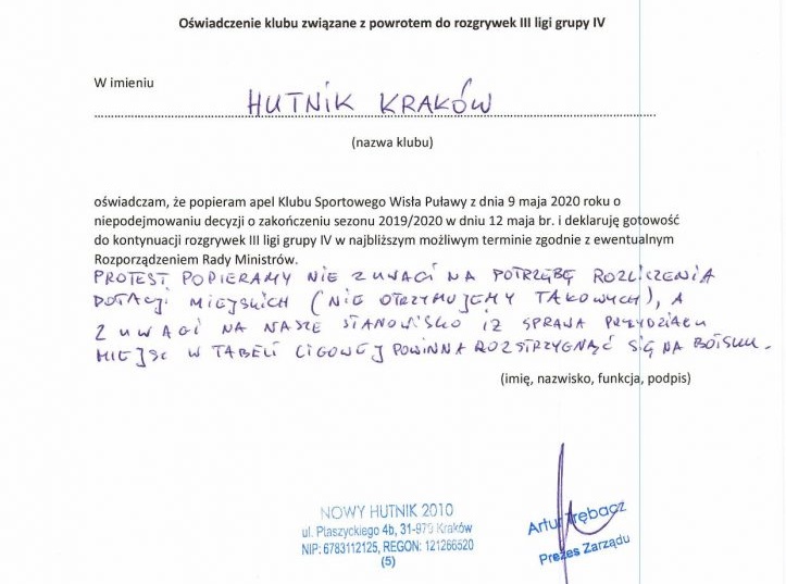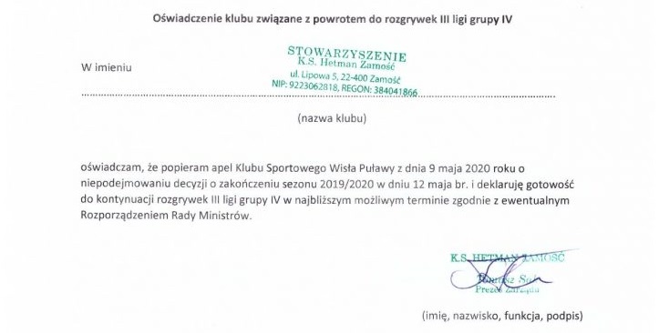 W dniu jutrzejszym decyzja co dalej z rozgrywkami 3 ligi. Najprawdopodobniej rozgrywki zostaną zakończone ze spadkami i awansami. Z takim postanowieniem nie zgadzają się kluby. Wisła Puławy napisała list do Zbigniewa Bońka. Poparło ich już dziesięć klubów gr. IV. Są to Chełmianka Chełm, Hetman Zamość, Hutnik Kraków, Motor Lublin, Orlęta Radzyń Podlaski, Siarka Tarnobrzeg, Texom Sokół Sieniawa, Wisła Sandomierz, Avia Świdnik, Wólczanka Wólka Pełkińska.