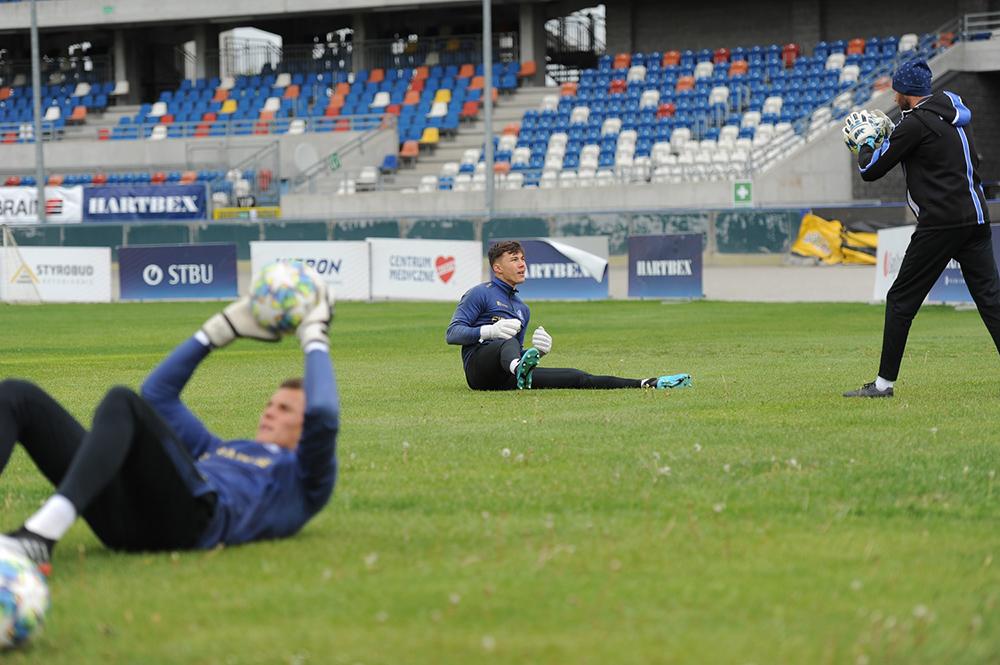 Zajęcia grupowe piłkarzy Stali Rzeszów na Stadionie Miejskim. Trening bramkarski.