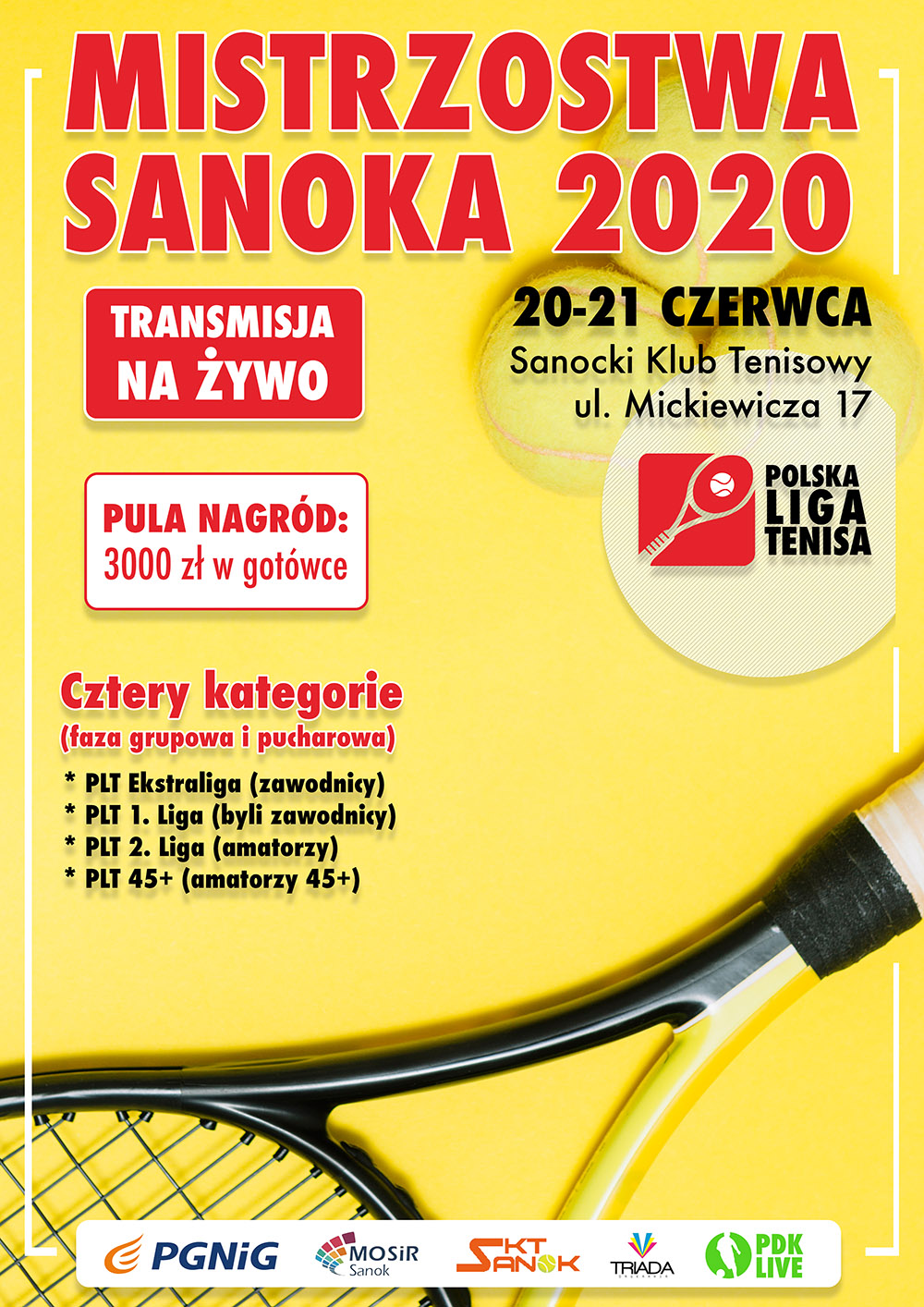 Już w najbliższy weekend odbędą się tenisowe Mistrzostwa Sanoka 2020 organizowane w ramach rozgrywek Polskiej Ligi Tenisa. Zaplanowano turnieje we wszystkich kategoriach (Ekstraliga - zawodnicy, I liga - byli zawodnicy, II liga - amatorzy i PLT 45+). Do wygrania aż 3 000 złotych. Z turnieju przeprowadzona zostanie transmisja na żywo.
