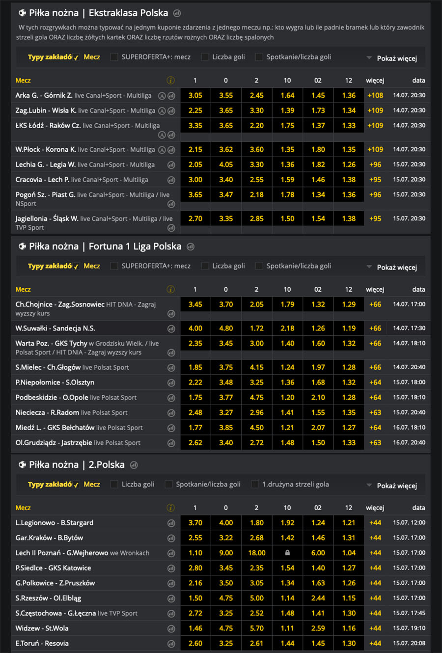 W Fortunie możesz obstawiać mecze polskich lig, m.in. Ekstraklasy, 1 ligi i 2 ligi. Sprawdź ofertę: