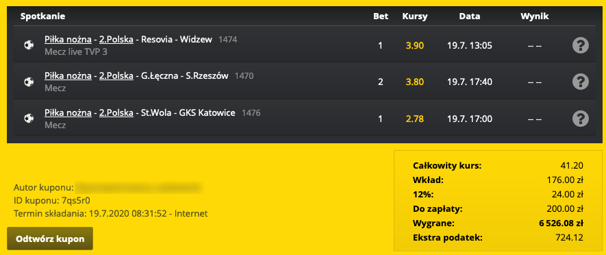 Załóż konto internetowe, a Twój pierwszy kupon będzie "Zakładem bez ryzyka". Jeżeli wygrasz, otrzymasz swoją wygraną. Jeżeli przegrasz, Fortuna zwróci Ci wkład za kupon aż do 200 PLN. Aby wykorzystać bonus w pełni, należy postawić pierwszy kupon za 227 PLN.