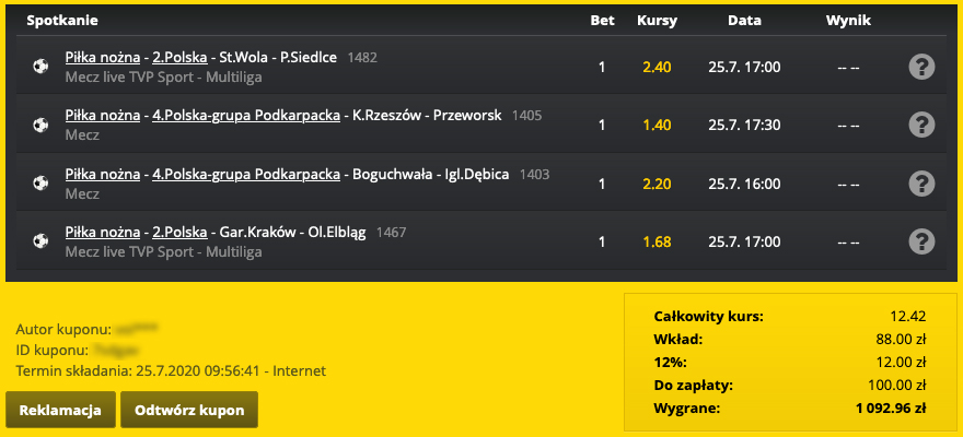 Łącznie - za postawione 100 zł - do wygrania mamy 1092,96 zł.