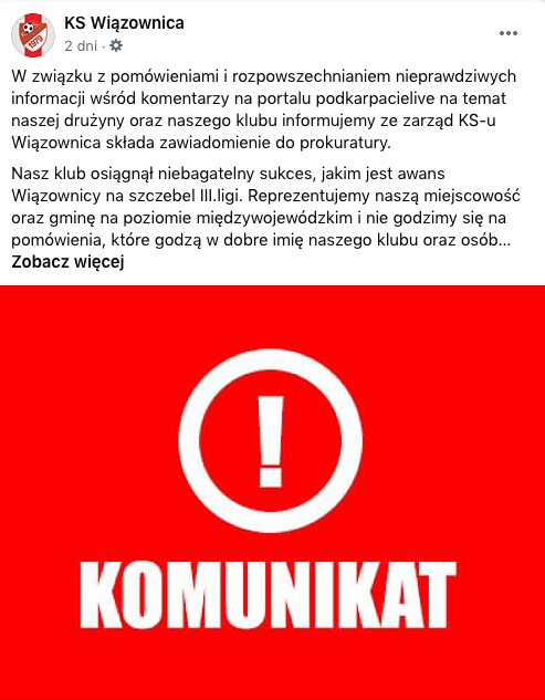 - W związku z pomówieniami i rozpowszechnianiem nieprawdziwych informacji wśród komentarzy na portalu podkarpacieLIVE na temat naszej drużyny oraz naszego klubu informujemy ze zarząd KS-u Wiązownica składa zawiadomienie do prokuratury - czytamy na fanpage'u KS Wiązownica.
