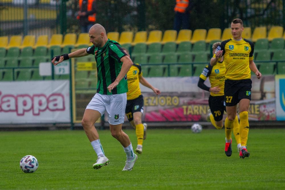 3/28 - 26.09.2020 - Piłkarze Stali Stalowa Wola (zielono-czarne koszulki) pokonali w meczu derbowym Siarkę Tarnobrzeg (żółte koszulki). Spotkanie zakończyło się wynikiem 1-4 (fot. Radosław Kuśmierz)