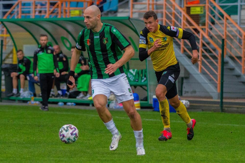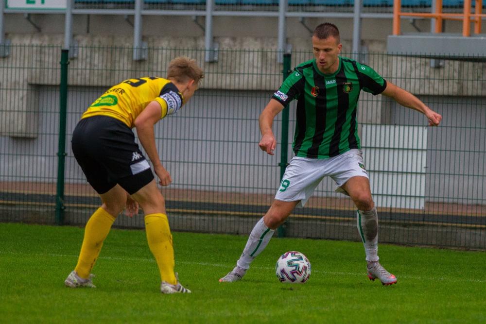 23/28 - 26.09.2020 - Piłkarze Stali Stalowa Wola (zielono-czarne koszulki) pokonali w meczu derbowym Siarkę Tarnobrzeg (żółte koszulki). Spotkanie zakończyło się wynikiem 1-4 (fot. Radosław Kuśmierz)