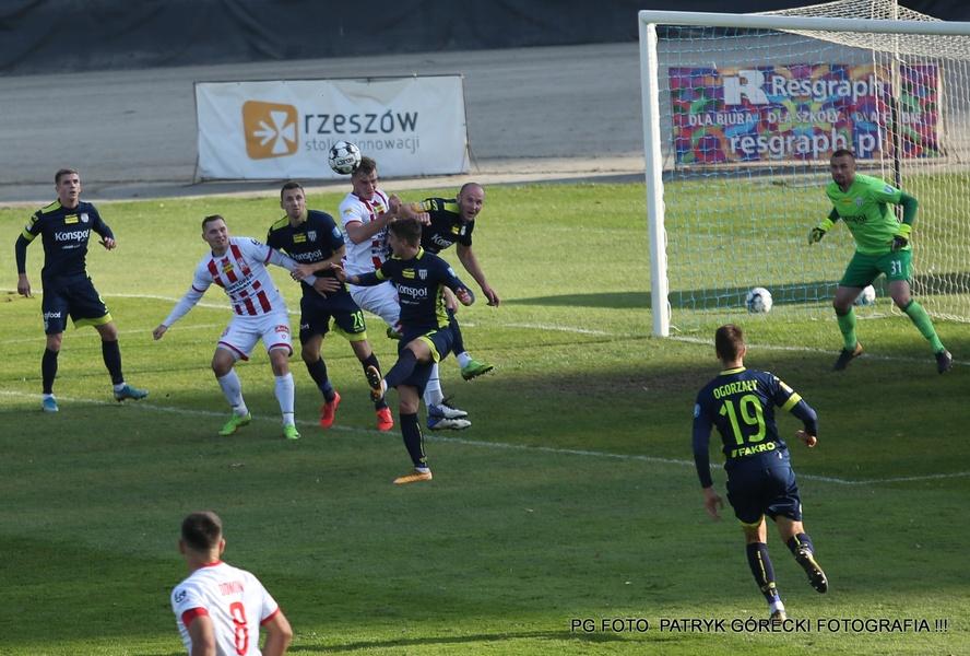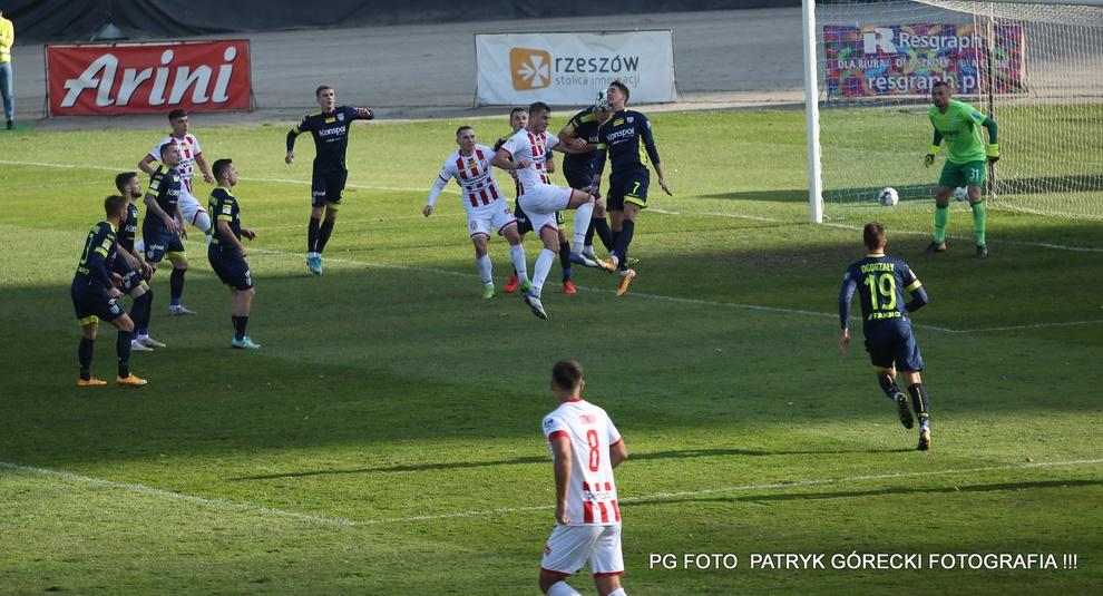 - Apklan Resovia (biało-czerwone stroje) bezbramkowo zremisowała z Sandecją Nowy Sącz (fot. Patryk Górecki)