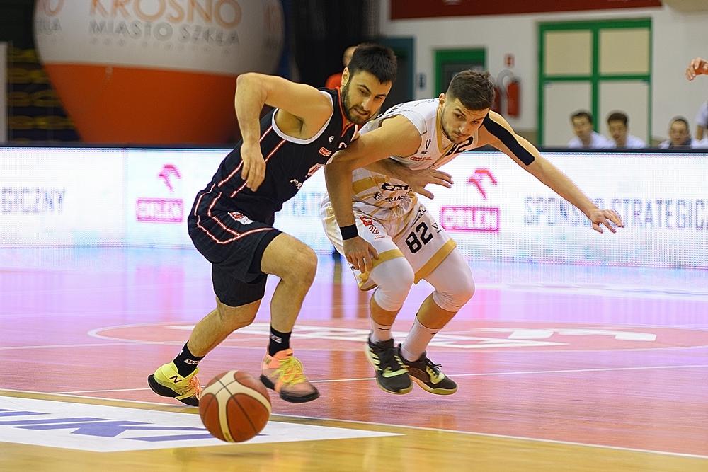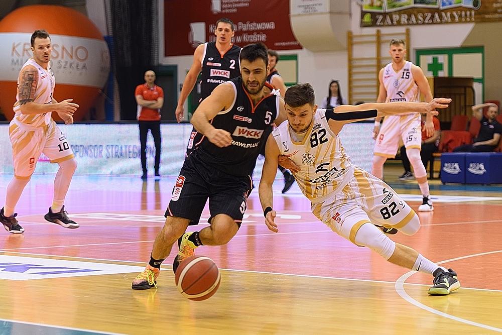 - Miasto Szkła Krosno (białe stroje) przegrało na własnym parkiecie z WKK Wrocław w meczu Suzuki 1 ligi mężczyzn (fot. Konrad Kwolek)