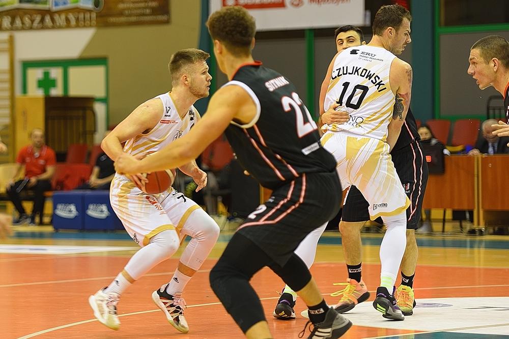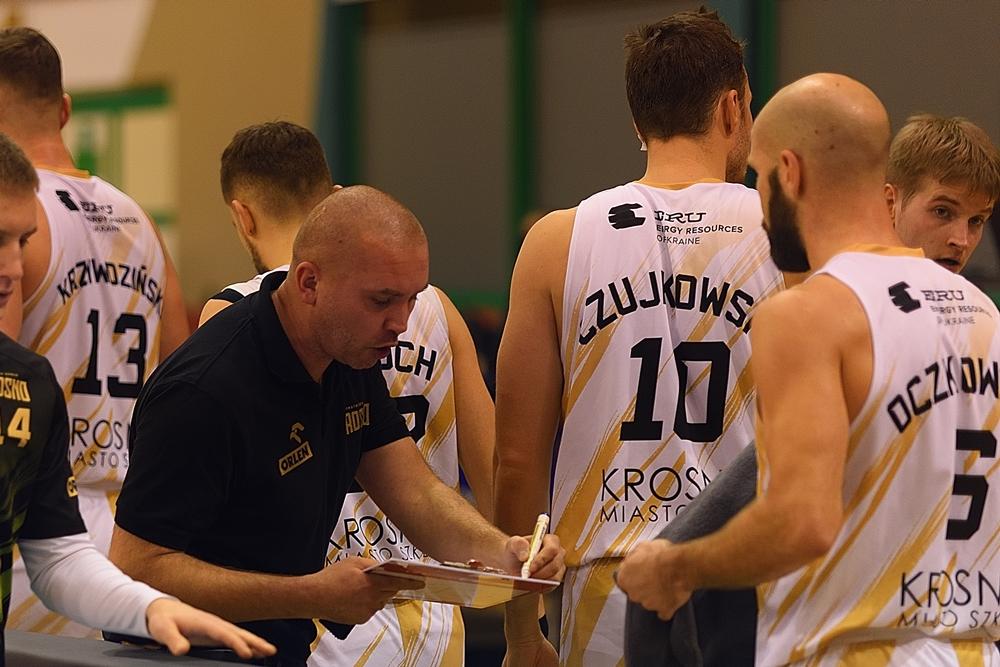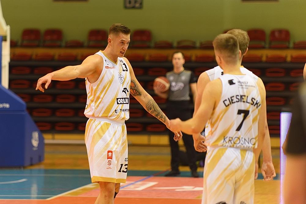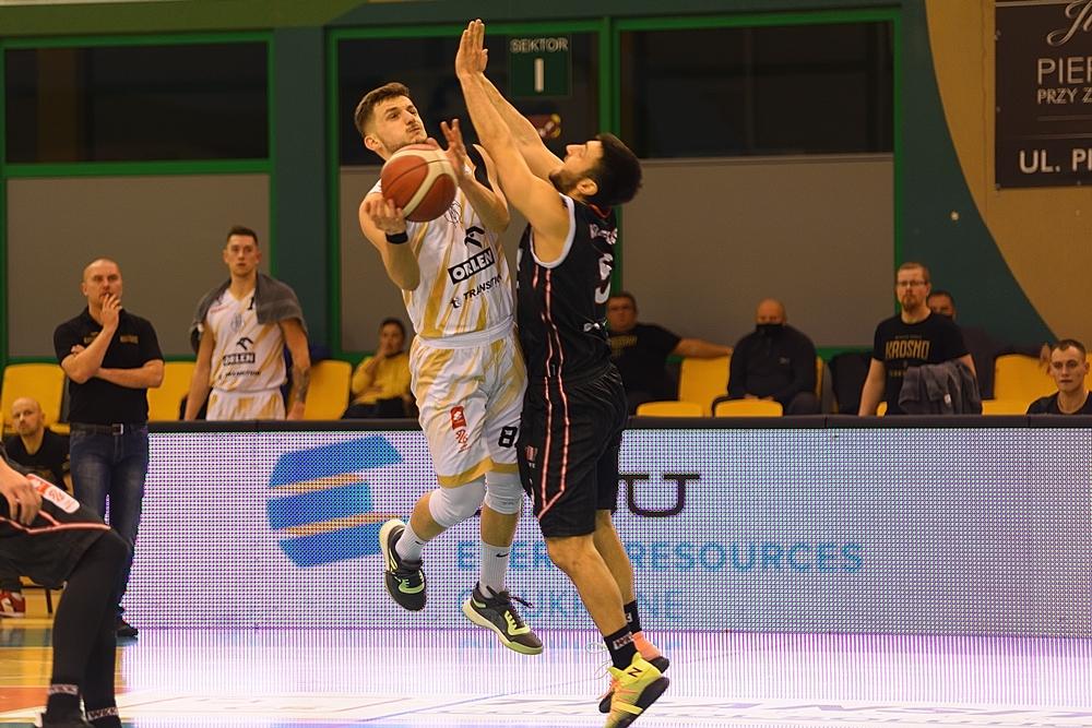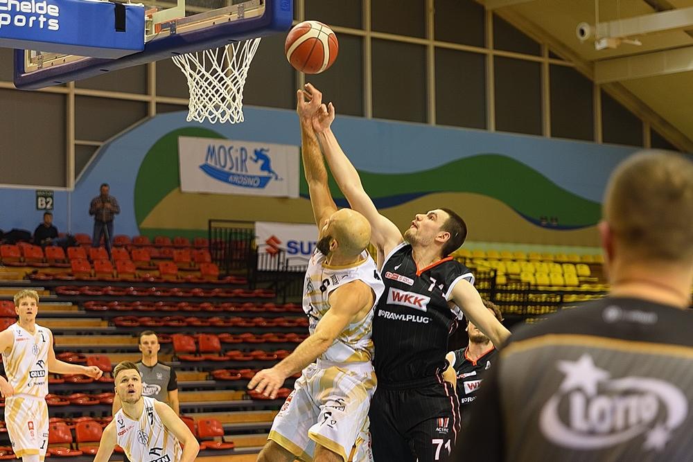 - Miasto Szkła Krosno (białe stroje) przegrało na własnym parkiecie z WKK Wrocław w meczu Suzuki 1 ligi mężczyzn (fot. Konrad Kwolek)