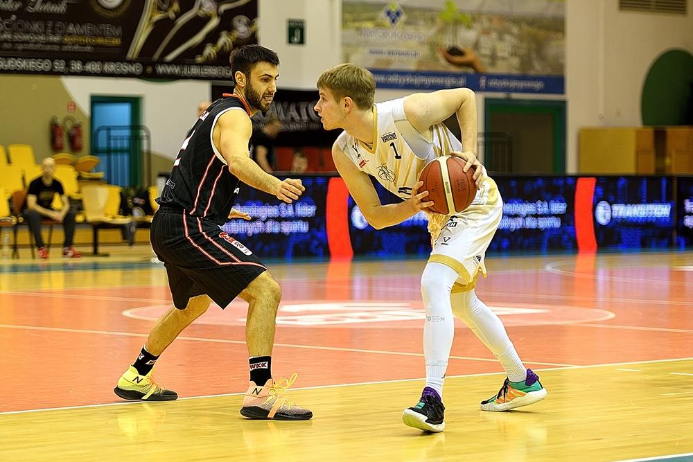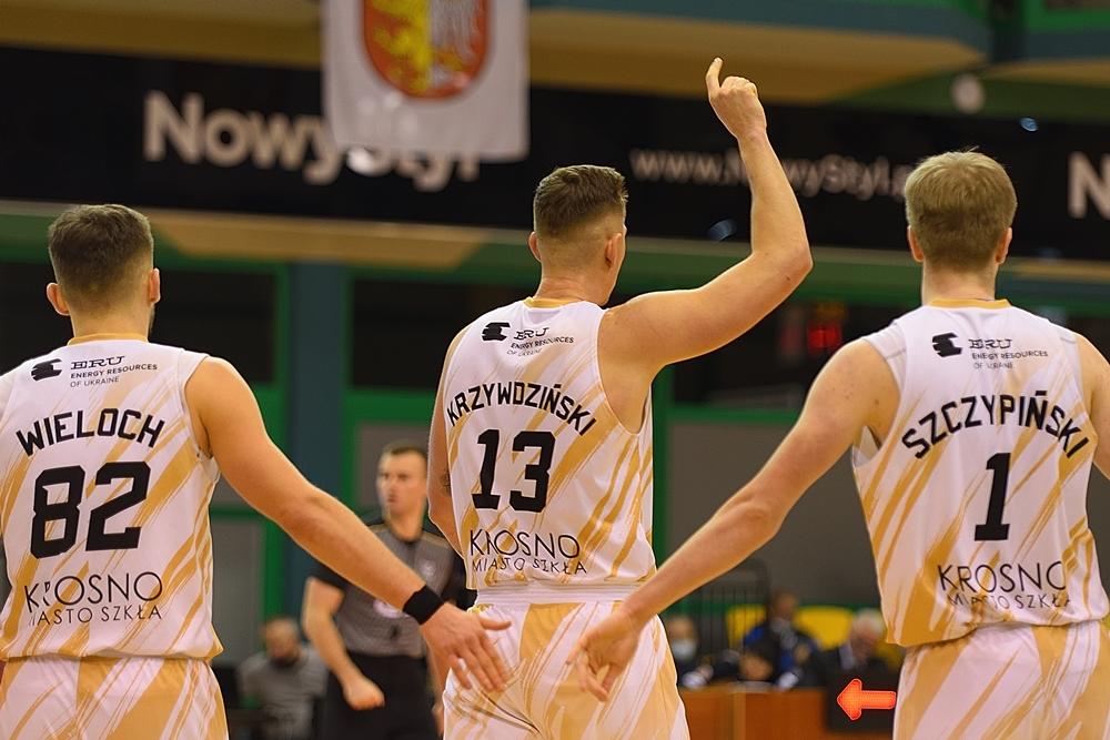- Miasto Szkła Krosno (białe stroje) przegrało na własnym parkiecie z WKK Wrocław w meczu Suzuki 1 ligi mężczyzn (fot. Konrad Kwolek)