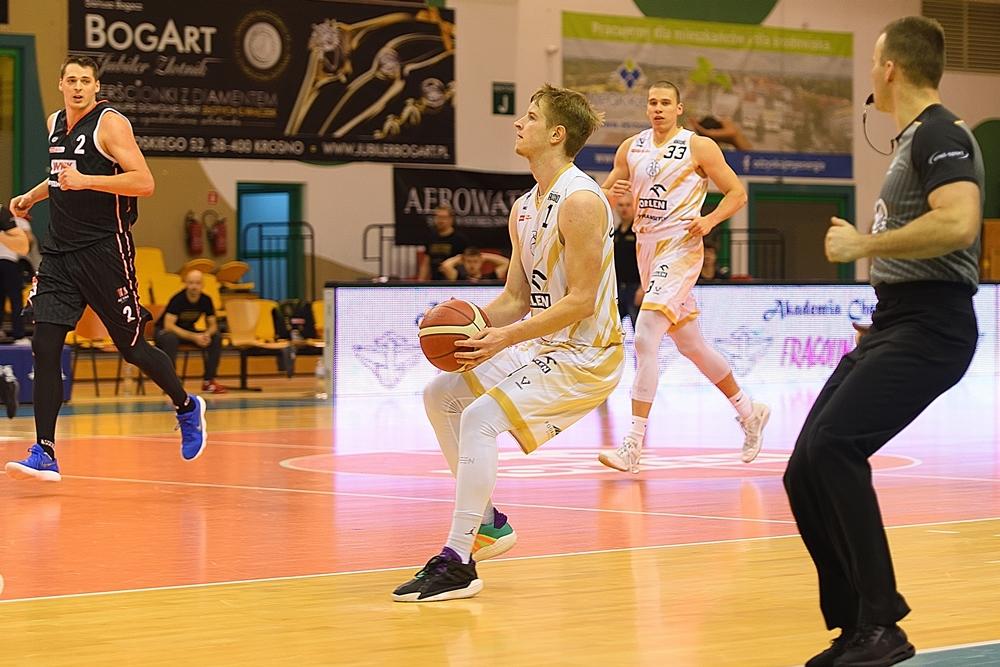 Fotogaleria zdjęć z meczu Suzuki 1 ligi mężczyzn w koszykówce mężczyzn pomiędzy Miastem Szkła Krosno a WKK Wrocław. Podkarpacki zespół przegrał 88-98.