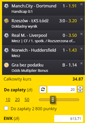 Do tego ważny mecz w TAURON Lidze przed nami. Siatkarki Developresu SkyRes Rzeszów zagrają z ŁKS-em Commercecon Łódź. My stawiamy na 3-0 dla ekipy Stephana Antigi za które bukmacherzy płacą aż 3,20. Do tego dokładamy mecz The Championship. Lider tabeli Norwich zmierzy się z Huddersfield. Kurs na zwycięstwo drużyny z Norwich płaci się 1,43.