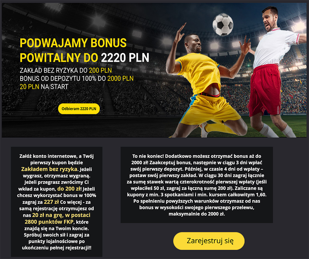 To jednak nie koniec niespodzianek od Fortuny. Jeżeli zdecydujesz się zarejestrować - otrzymasz darmowe 20 zł, które będziesz mógł wykorzystać na grę. Bez żadnych wpłat. Jeżeli jednak zdecydujesz się na wpłatę - czeka kolejna niespodzianka. Oprócz wspomnianego wyżej zakładu bez ryzyka - otrzymasz 100% więcej niż wpłaciłeś. Aż do 2000 zł.