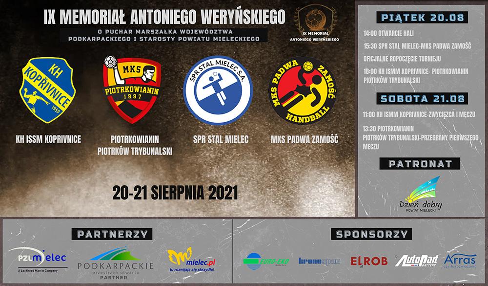 Oprócz gospodarzy SPR Stali Mielec na boisko mieleckiej hali w trakcie Memoriału Antoniego Weryńskiego wybiegną takie zespoły jak: zdobywca szóstego miejsca w tabeli finałowej czeskiej ekstraligi - KH ISSM Koprivnice, MKS Piotrkowianin Piotrków Trybunalski (Superliga) oraz pierwszoligowy MKS Padwa Zamość.