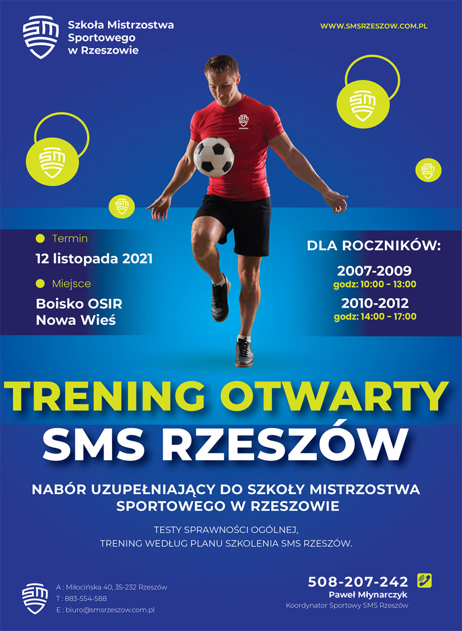 Trening otwarty będący jedocześnie naborem uzupełniającym do Szkoły Mistrzostwa Sportowego w Rzeszowie odbędzie się w piątek 12 listopada na boisku OSiR Nowa Wieś. Od godz. 10 do 13 trenować będą rocznik 2007-2009, a od 14 do 17 rocznik 2010-2012.