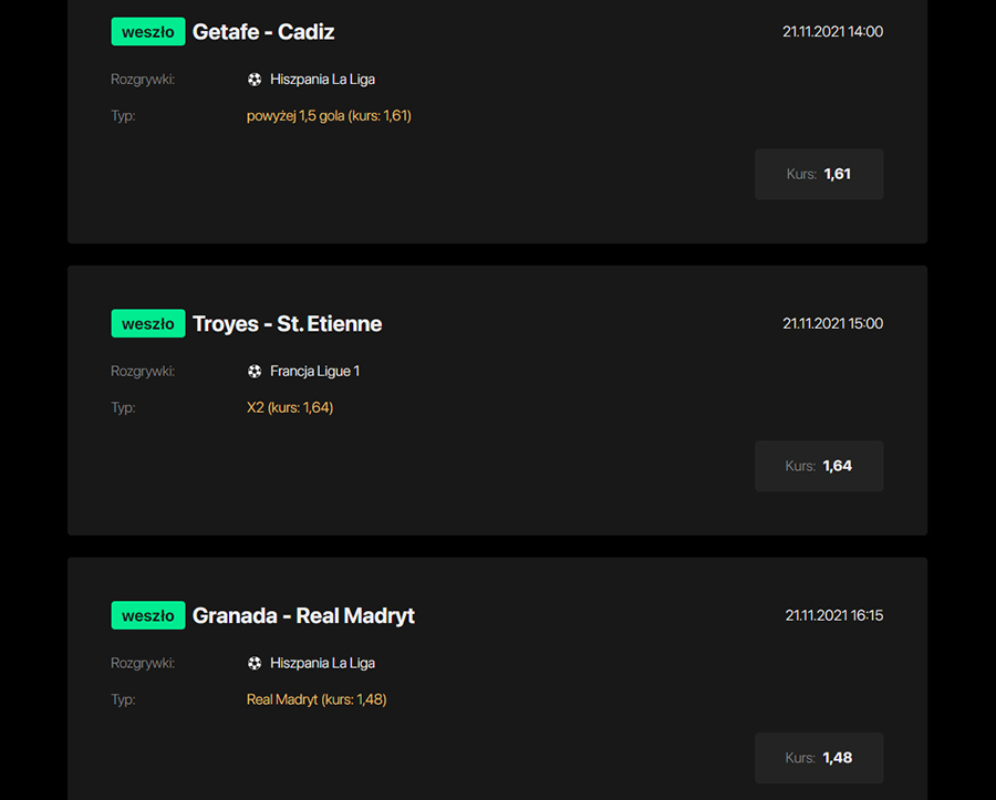 Każdego dnia możemy liczyć na propozycję obstawionego kuponu za 50 PLN u jednego z partnerów portalu. Są to zakłady AKO złożone z 3-4 zdarzeń, więc z reguły nie ma tu problemu z potrojeniem stawki początkowej. Oprócz proponowanych kuponów ze szczegółową analizą, dostajemy także pojedyncze typy, które możemy wybrać dodatkowo lub jako popularne zakłady single. Warto skorzystać z darmowych porad, bo zwłaszcza w uboższe dni pozwalają one na stworzenie sensownego kuponu.