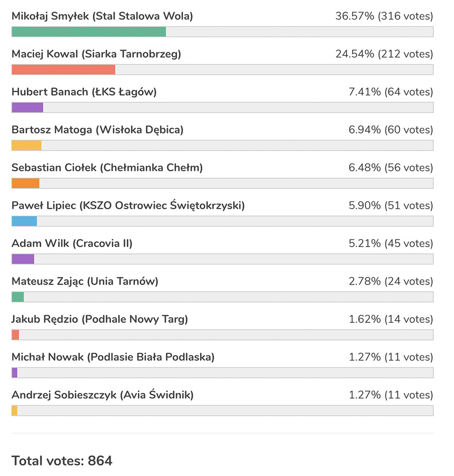 W głosowaniu na najlepszego bramkarza w 3 lidze gr. IV oddaliście łącznie 864 głosy. Zwyciężył Mikołaj Smyłek ze Stali Stalowa Wola, który otrzymał aż 36,57% z całości głosów (316). Drugie miejsce zajął Maciej Kowal z Siarki Tarnobrzeg. I to właśnie ta dwójka dostaje się do jedenastki kolejki - pierwszy jako główny bramkarz, a drugi jako rezerwowy.