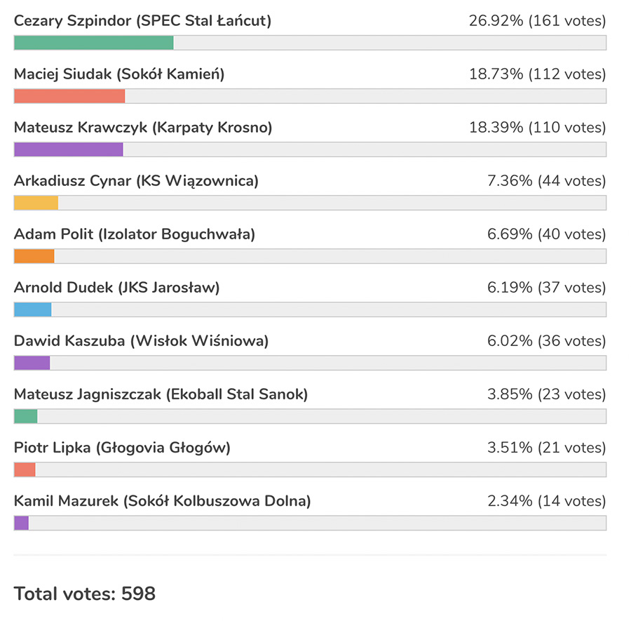 Wśród bramkarzy 4 ligi podkarpackiej najlepszy okazał się Cezary Szpindor ze SPEC Stali Łańcut (161 głosów - 26,92% całości). To on zostaje głównym bramkarzem. Drugie miejsce i pozycja rezerwowego przypadła Maciejowi Siudakowi z Sokoła Kamień, który zdobył 112 głosów i zaledwie o 2 pokonał Mateusza Krawczyka z Karpat Krosno. W tej kategorii oddaliście 598 głosów.