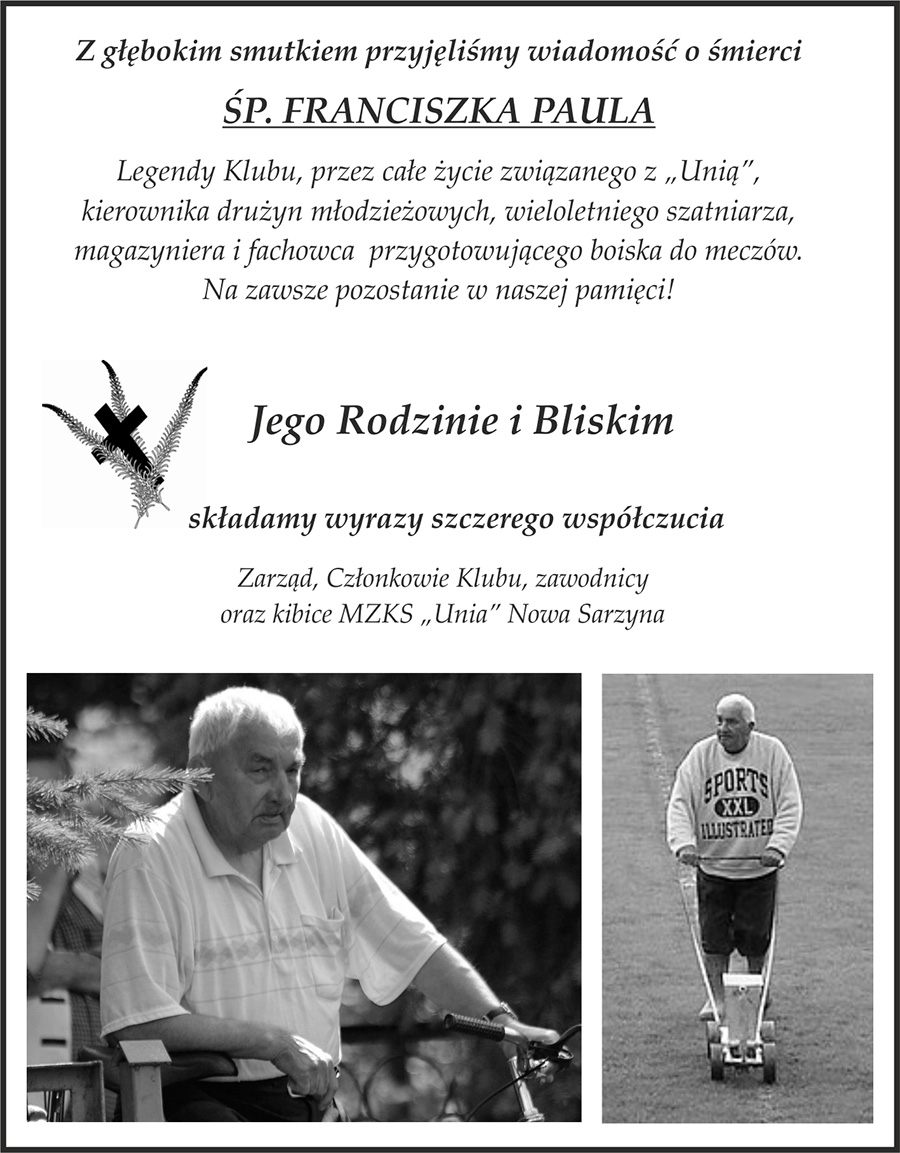 - Z głębokim smutkiem przyjęliśmy wiadomość o śmierci ŚP. Franciszka Paula, legandy klubu, przez całe życie związanego z Unią Nowa Sarzyna, kierownika drużyn młodzieżowych, wieloletniego szatniarza, magazyniera i fachowca przygotowującego boiska do meczów. Na zawsze pozostanie w najszej pamięci - czytamy na stronie internetowej klubu.