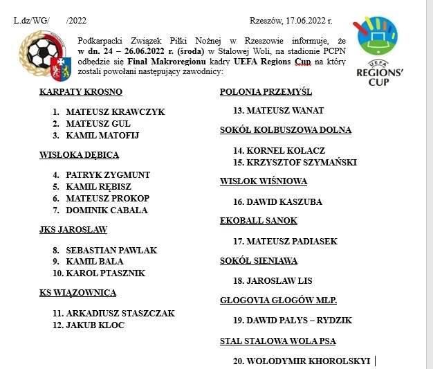Podkarpacki Związek Piłki Nożnej ogłosił kadrę na turniej finałowy makroregionu UEFA Regions Cup. Ten odbędzie się w dniach 24-26 czerwca 2022 roku na obiektach Podkarpackiego Centrum Piłki Nożnej w Stalowej Woli. Selekcjonerem kadry Podkarpackiego ZPN-u jest Marcin Wołowiec, który na codzień pracuje w KS-ie Wiązownica, z ktorym niedawno wywalczył awans do 3 ligi gr. IV.