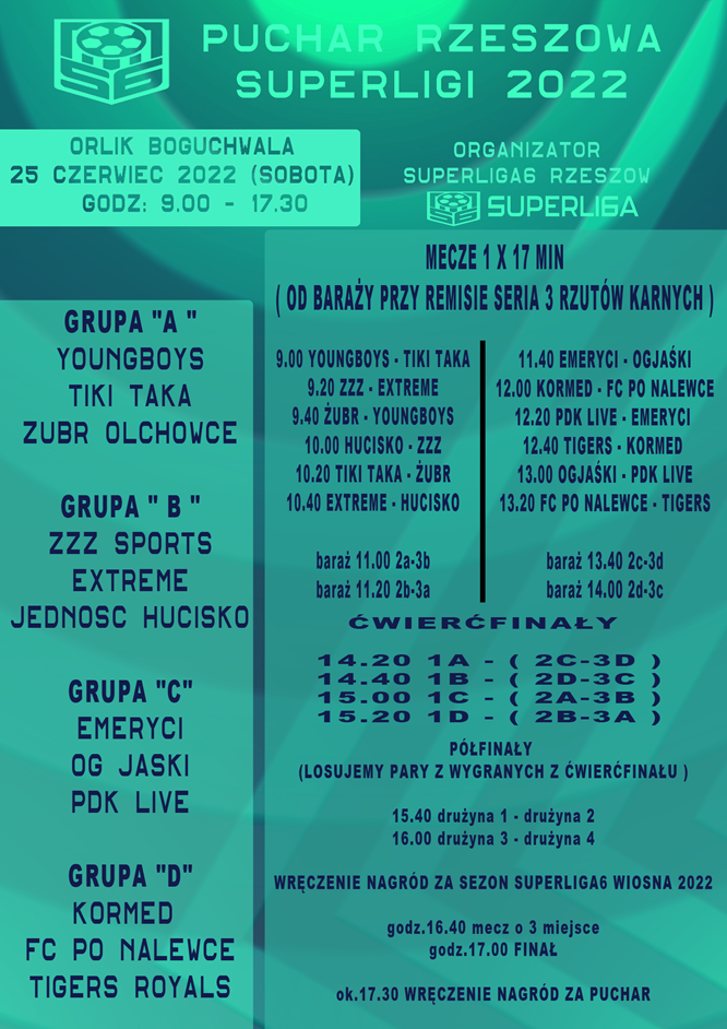 25 czerwca na orliku w Boguchwale odbędzie się Puchar Rzeszowa Super Ligi 6- piłkarska liga szóstek.