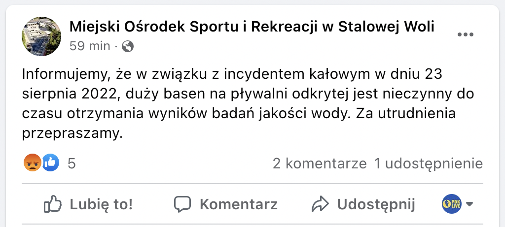 - Informujemy, że w związku z incydentem kałowym w dniu 23 sierpnia 2022 roku, duży basen na pływalni odkrytej jest nieczynny do czasu otrzymania wyników badań jakości wody. Za utrudnienia przepraszamy - czytamy w mediach społecznościowych Miejskiego Ośrodka Sportu i Rekreacji w Stalowej Woli.