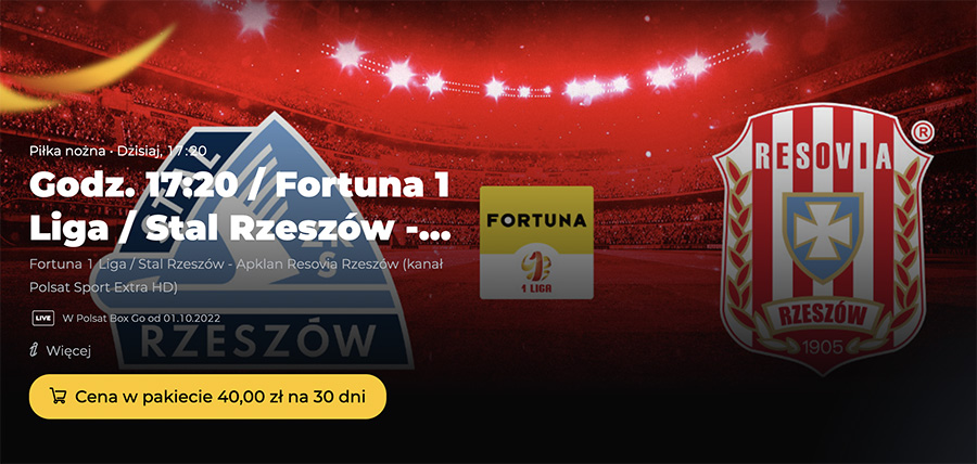 Dobrą informacją dla kibiców jest również fakt, że derby Rzeszowa pomiędzy Stalą a Resovią będzie można oglądać także w internecie. Transmisja TV online będzie dostępna na Polsat Box Go. Niestety dostęp do tej platformy jest płatny i kosztuje 40 PLN. W tej cenie macie miesięczy dostęp do całej platformy, a więc, oprócz derbów Rzeszowa, do wszystkich innych meczów Fortuna 1. Ligi.