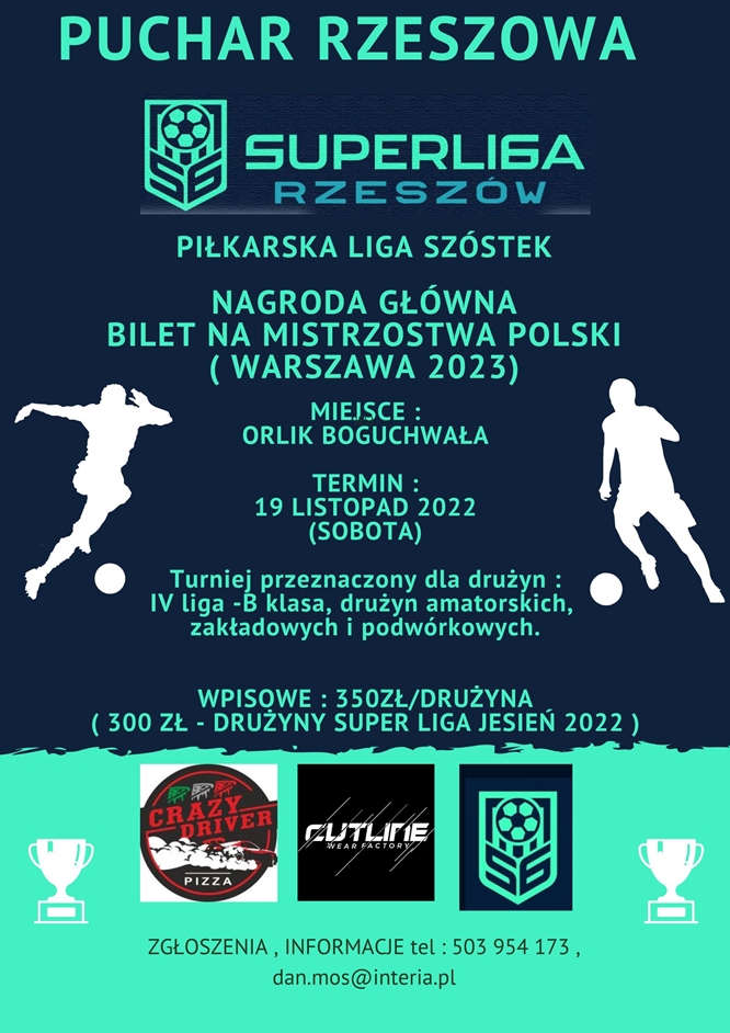 Puchar Rzeszowa to zwieńczenie jesiennej rundy Super Ligi Szóstek. Już 19 listopada, na orliku w Boguchwale odbędzie finał zmagań, do którego trwają zapisy. Puchar dedykowany jest dla dla drużyn od IV ligi do B klasy z dużych boisk oraz zespołów firmowych, podwórkowych i amatorskich. Nagroda główna to bilet na Puchar Polski Superliga6.pl, który odbędzie się w lipcu 2023 roku w Warszawie.
