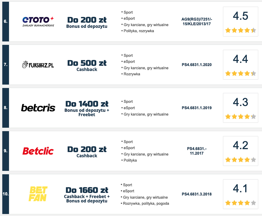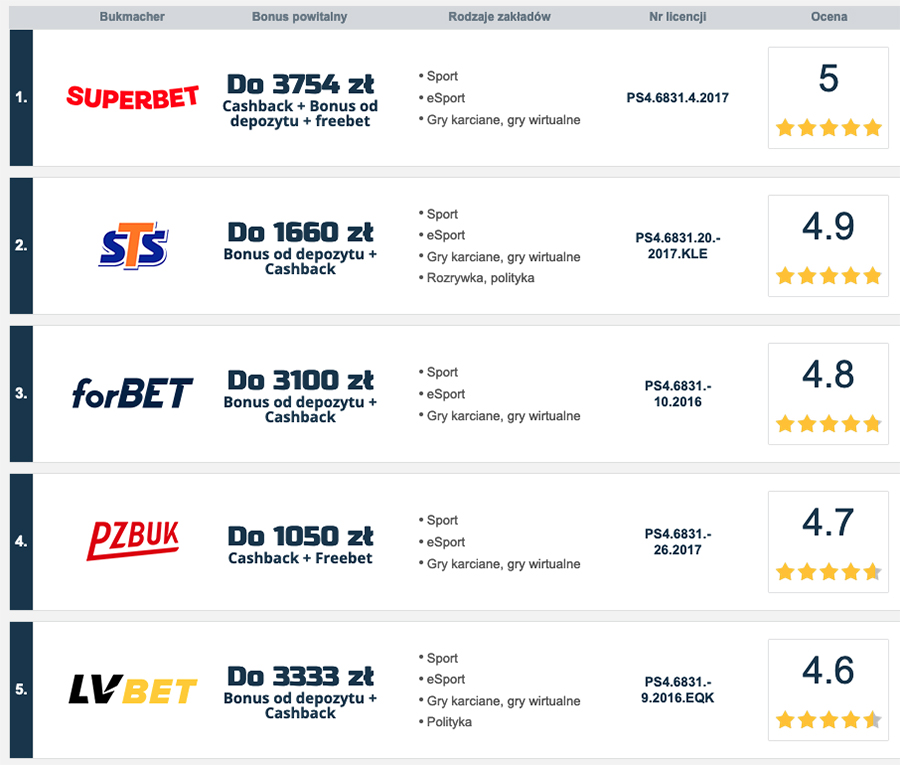 Wszystkie opisane w artykule firmy bukmacherskie to legalny podmioty prowadzące działalność na postawie licencji wydanej przez Ministerstwo Finansów RP. Uczestnictwo osób poniżej 18 roku życia w grach hazardowych jest zakazane. Hazaraz stwarza wysokie ryzyko straty finansowej, a nadmierna gra niesie ze sobą potencjalne zgrożenie dla zdrowia. Numery licencji: SuperBet (PS4.6831.4.2017), STS (PS4.6831.20.2017.KLE), forBET (PS4.6831.10.2016), PZBUK (PS4.6831.26.2017), LV BET (PS4.6831.9.2016.EQK), eTOTO (AG9(RG3)/7251/15/KLE/2013/17), Fuksiarz (PS4.6831.1.2020), Betcris (PS4.6831.1.2019), Betclic (PS4.6831.11.2017), BetFan (PS4.6831.3.2018)