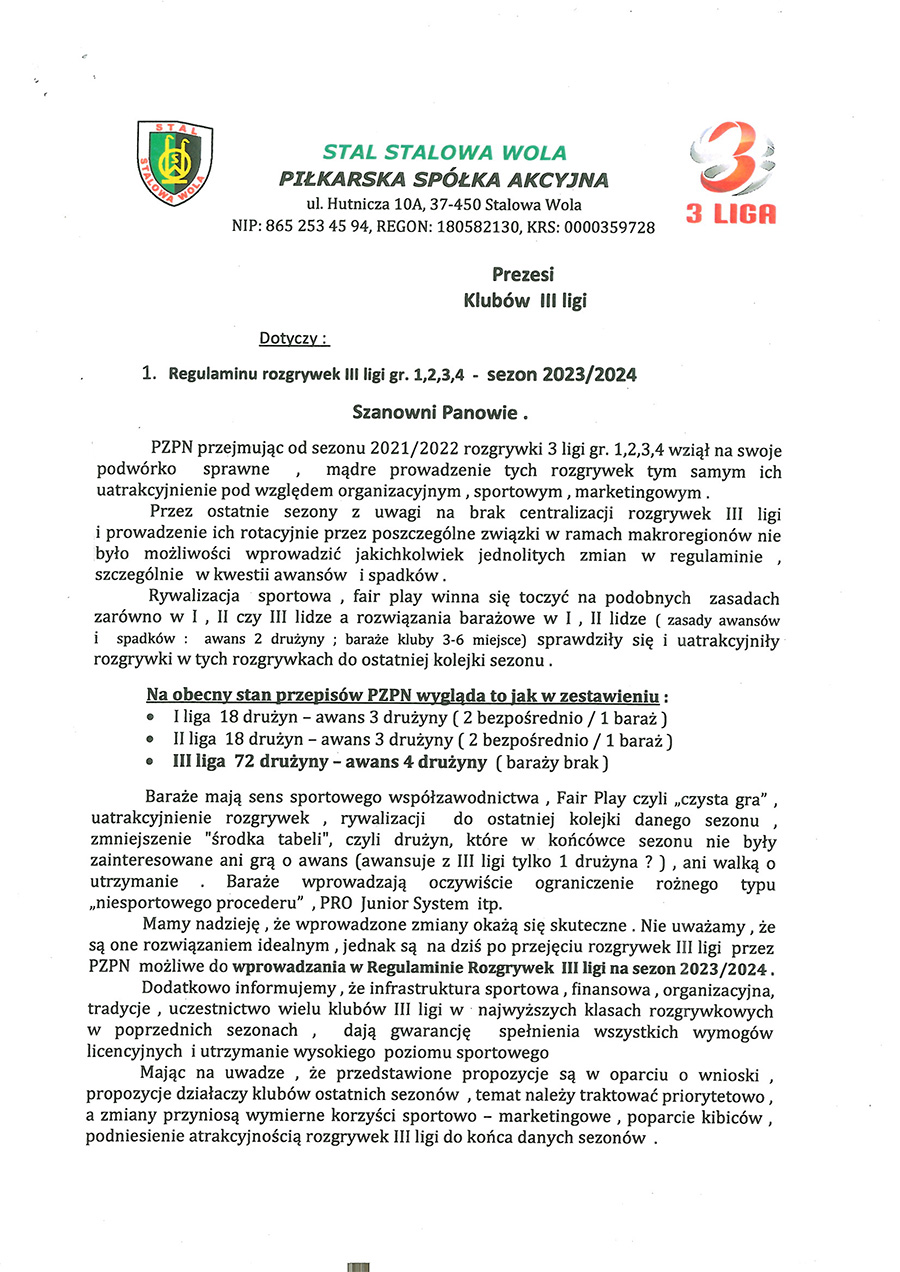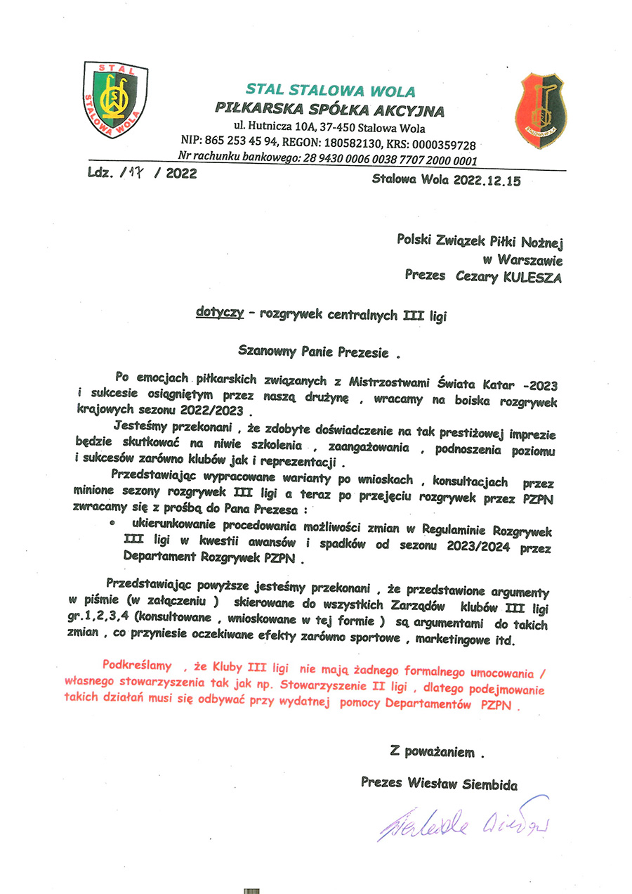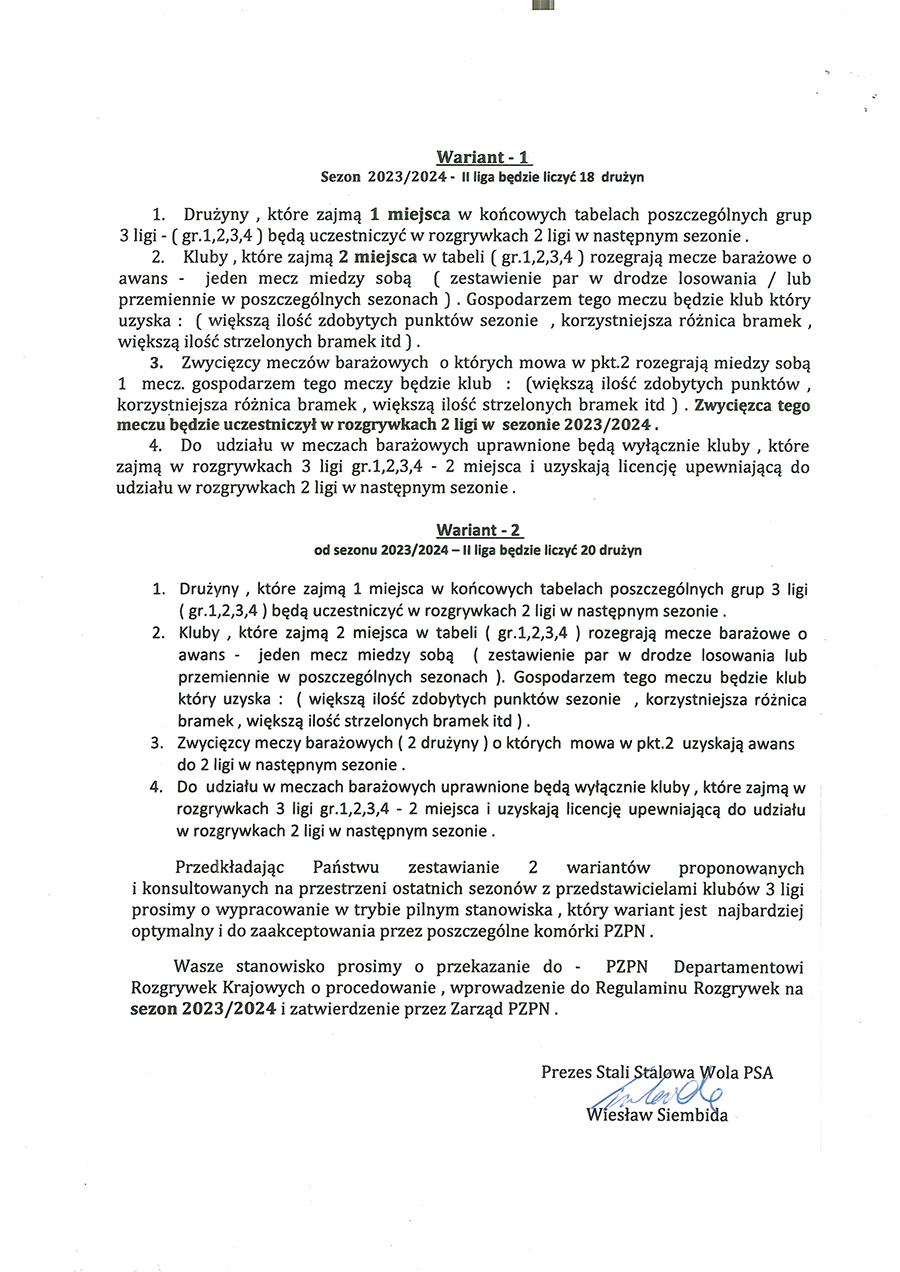 - ... o ukierunkowanie procedowania (kontynuuje Wiesław Siembida, autor listu - przyp. red.) możliwości zmian w regulaminie rozgrywek III ligi w kwestii awansów i spadków od sezonu 2023/2024 przez Departament Rozgrywek PZPN.